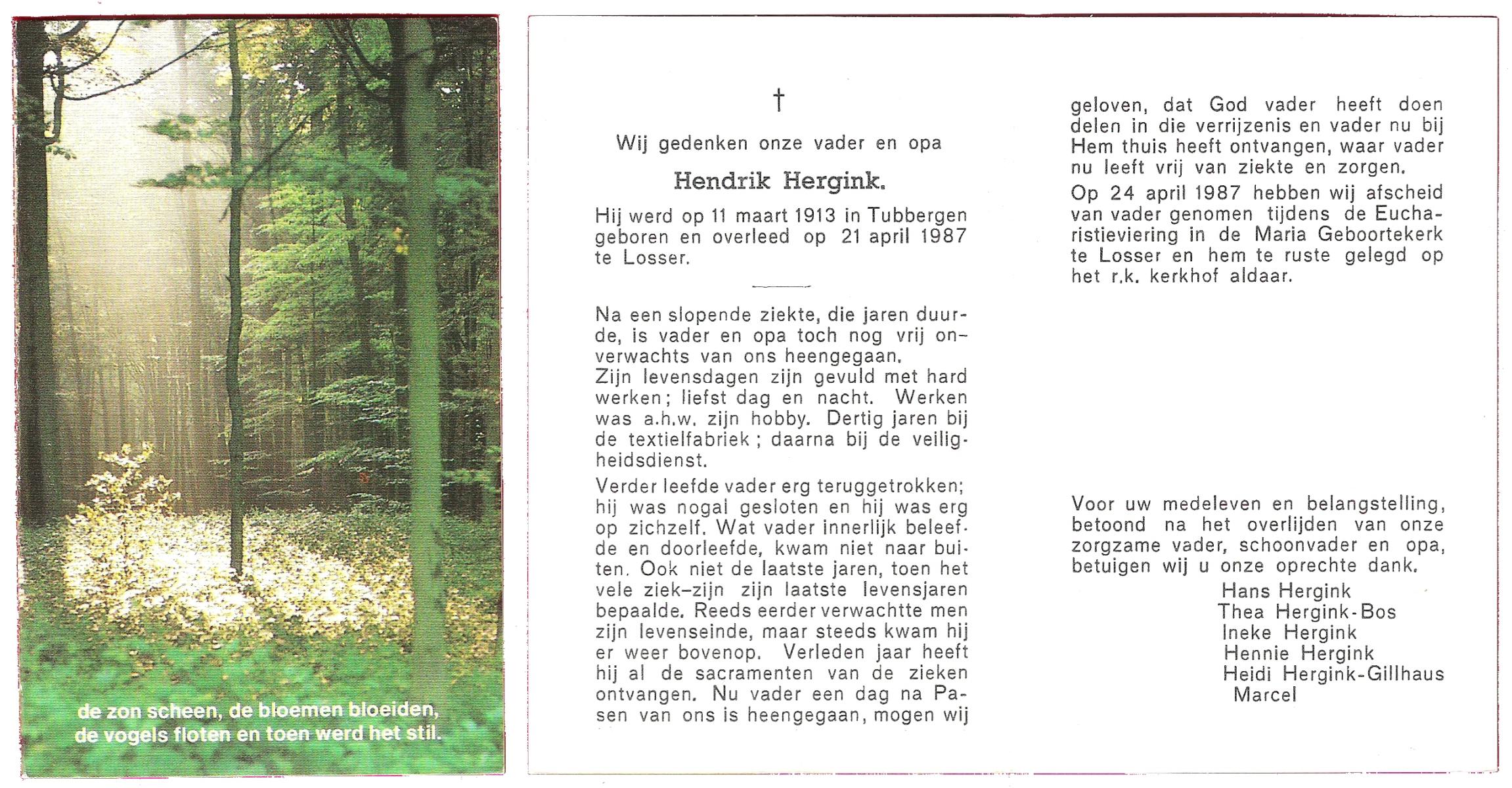 HILDERINK, Herman Johan, geboren op 31-5-1934 te Haaksbergen, overleden op 28-12-1987 te Enschede op 53-jarige leeftijd, gecremeerd op 31-12-1987 te Usselo.
