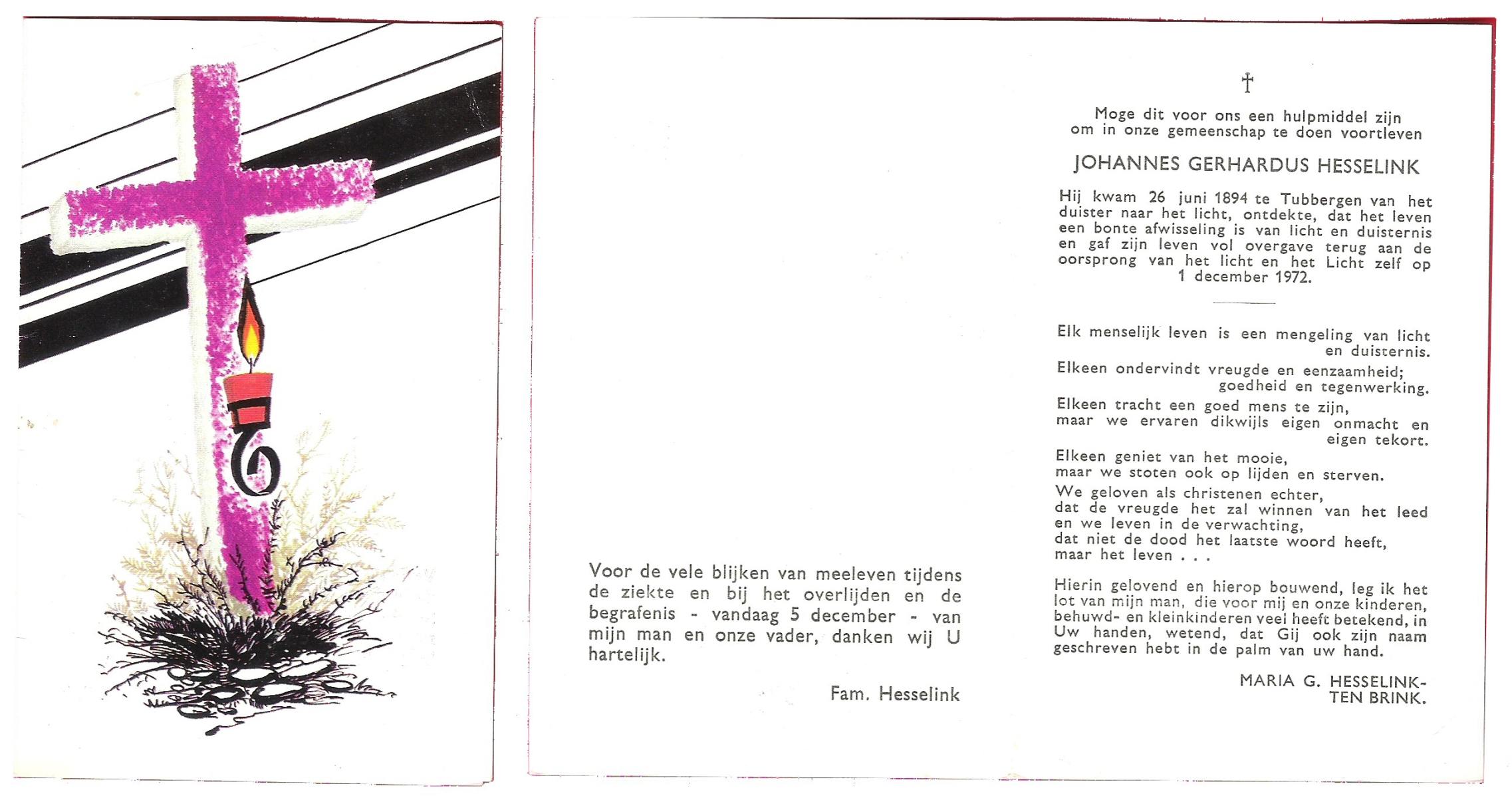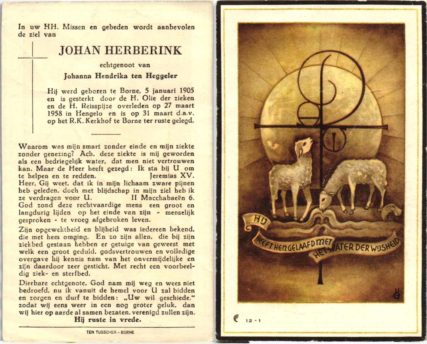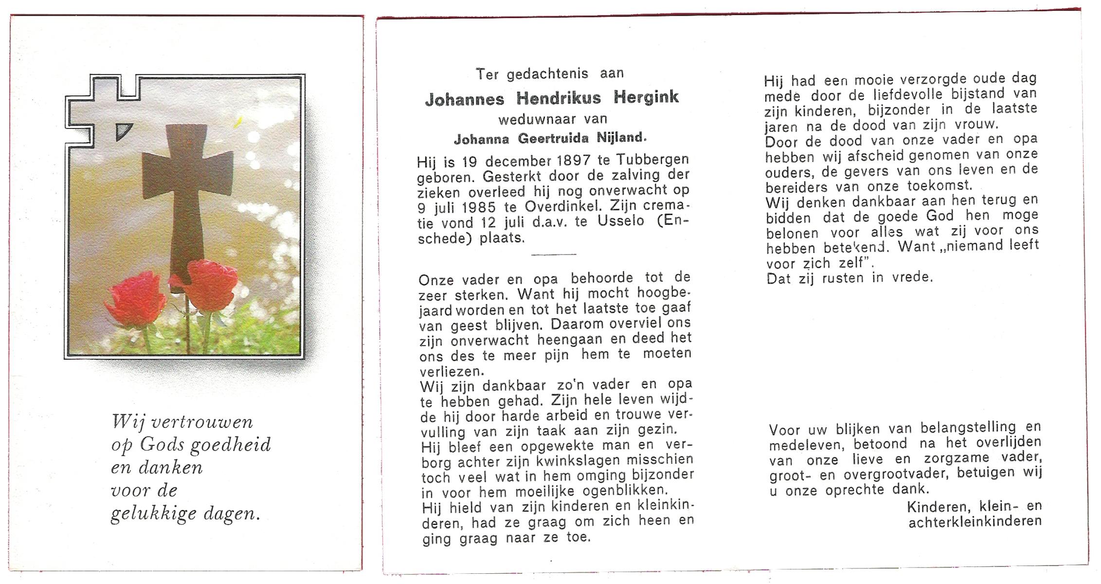 HILBERINK, Johannes Hermanus, geboren op 19-4-1930 te Harbrinkhoek, overleden op 31-12-1988 te Tubbergen op 58-jarige leeftijd, begraven op 5-1-1989 te Tubbergen R.K.kerkhof.