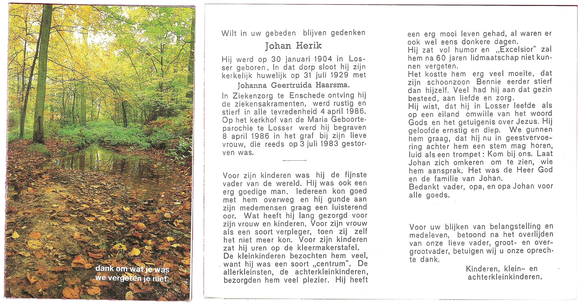 HILDERINK, Johan, geboren op 7-12-1901 te Haaksbergen, overleden op 11-4-1986 te Haaksbergen op 85-jarige leeftijd, begraven op 15-4-1986 te Haaksbergen.