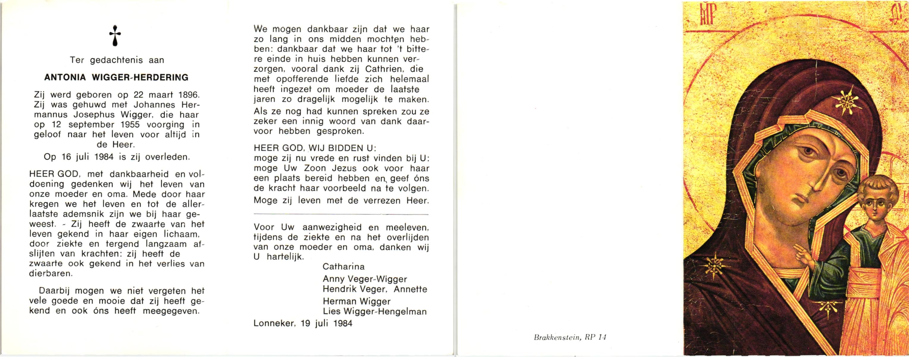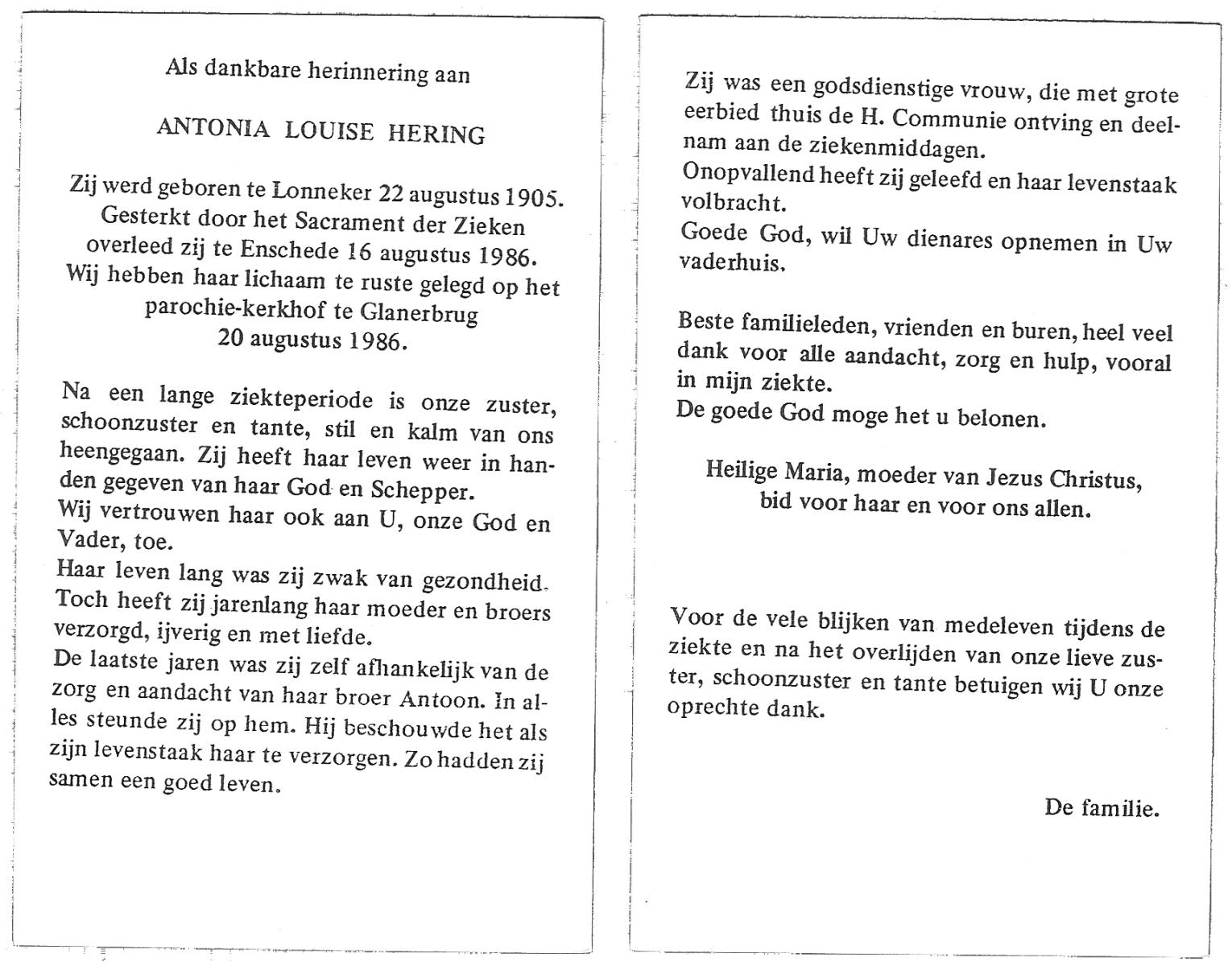 HILGERINK, Tonia, geboren op 15-05-1895 te Hengelo (O), overleden op 13-10-1980 te Hengelo (Ov.) op 85-jarige leeftijd, begraven op 16-10-1980 te Hengelo (Ov.).
