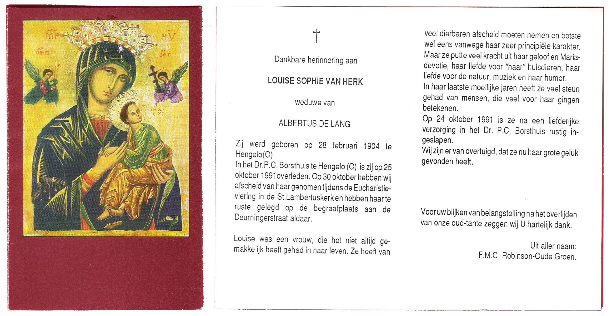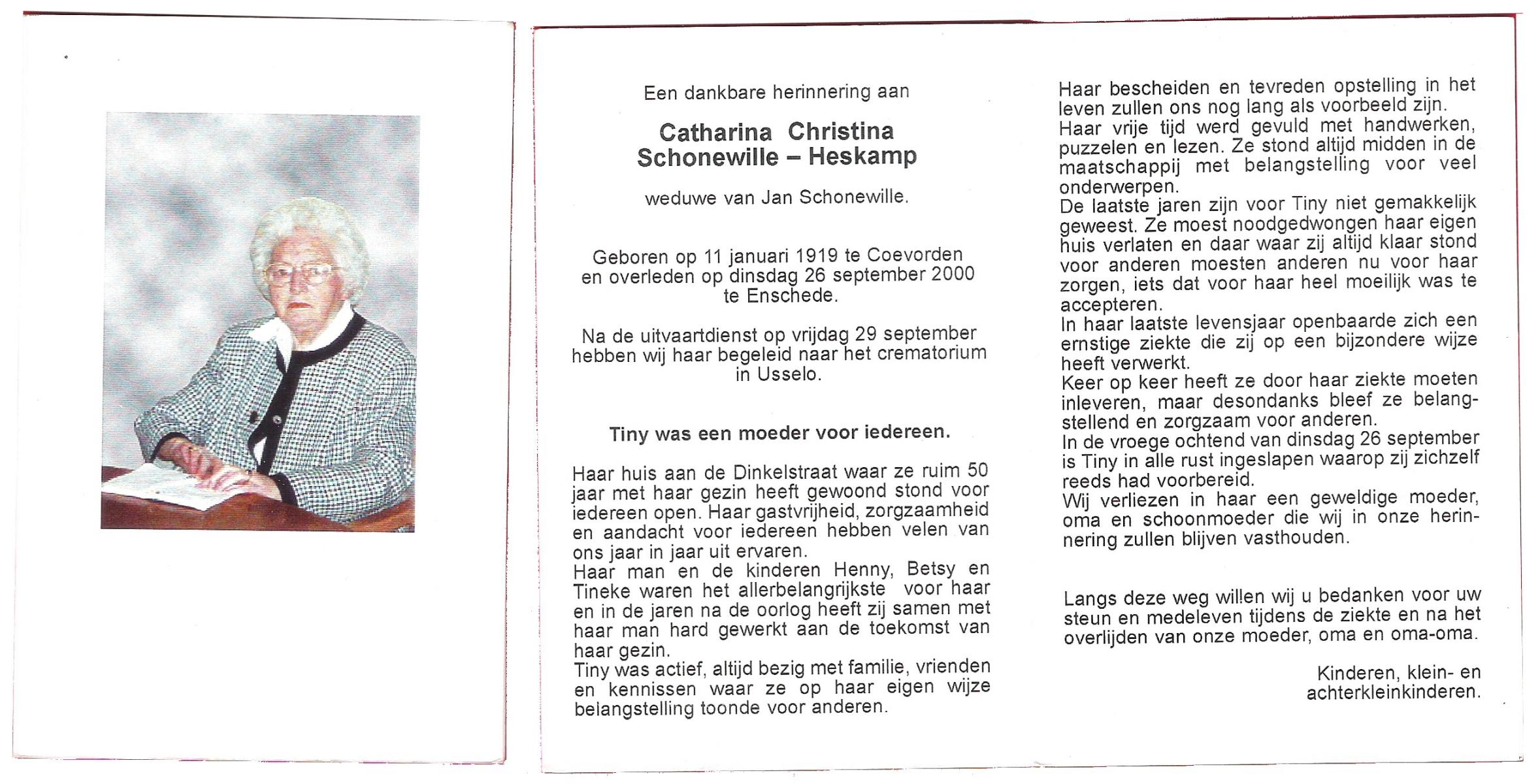 HILDERINK, Catharina Hendrika, geboren op 29-9-1909 te Haaksbergen, overleden op 24-9-1991 te Haaksbergen op 81-jarige leeftijd, begraven op 28-9-1991 te Buurse.