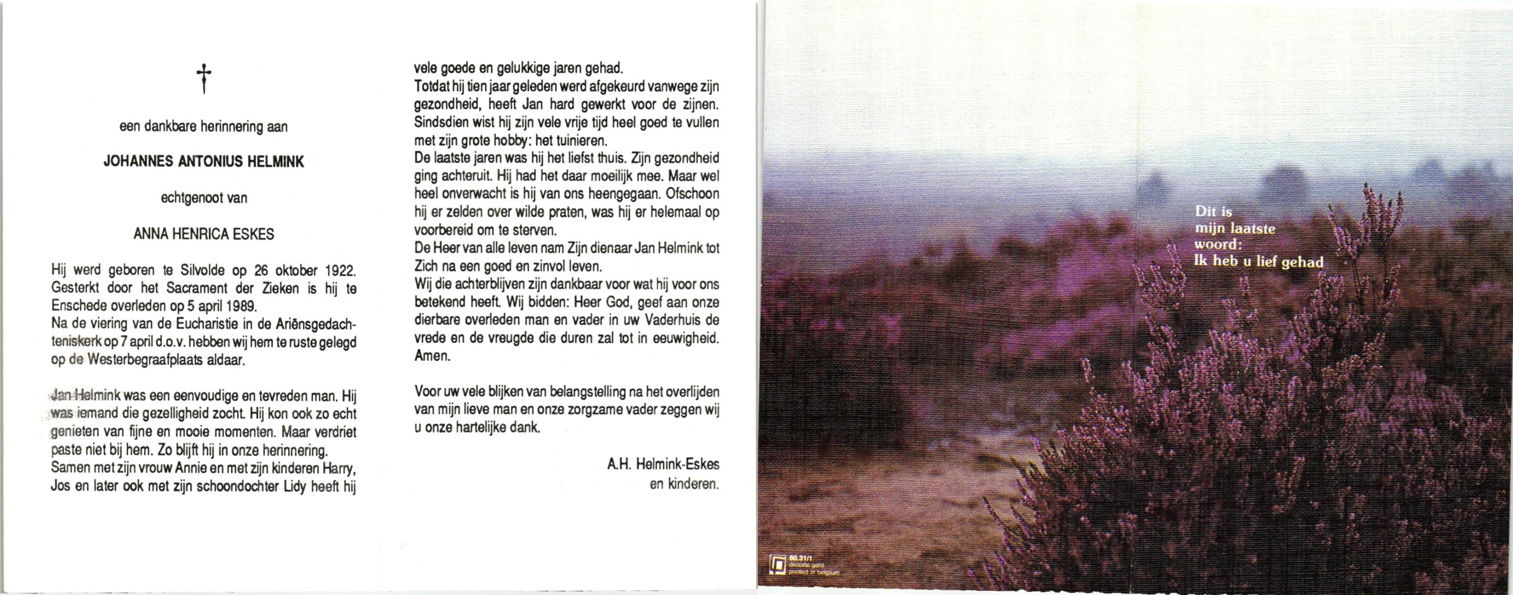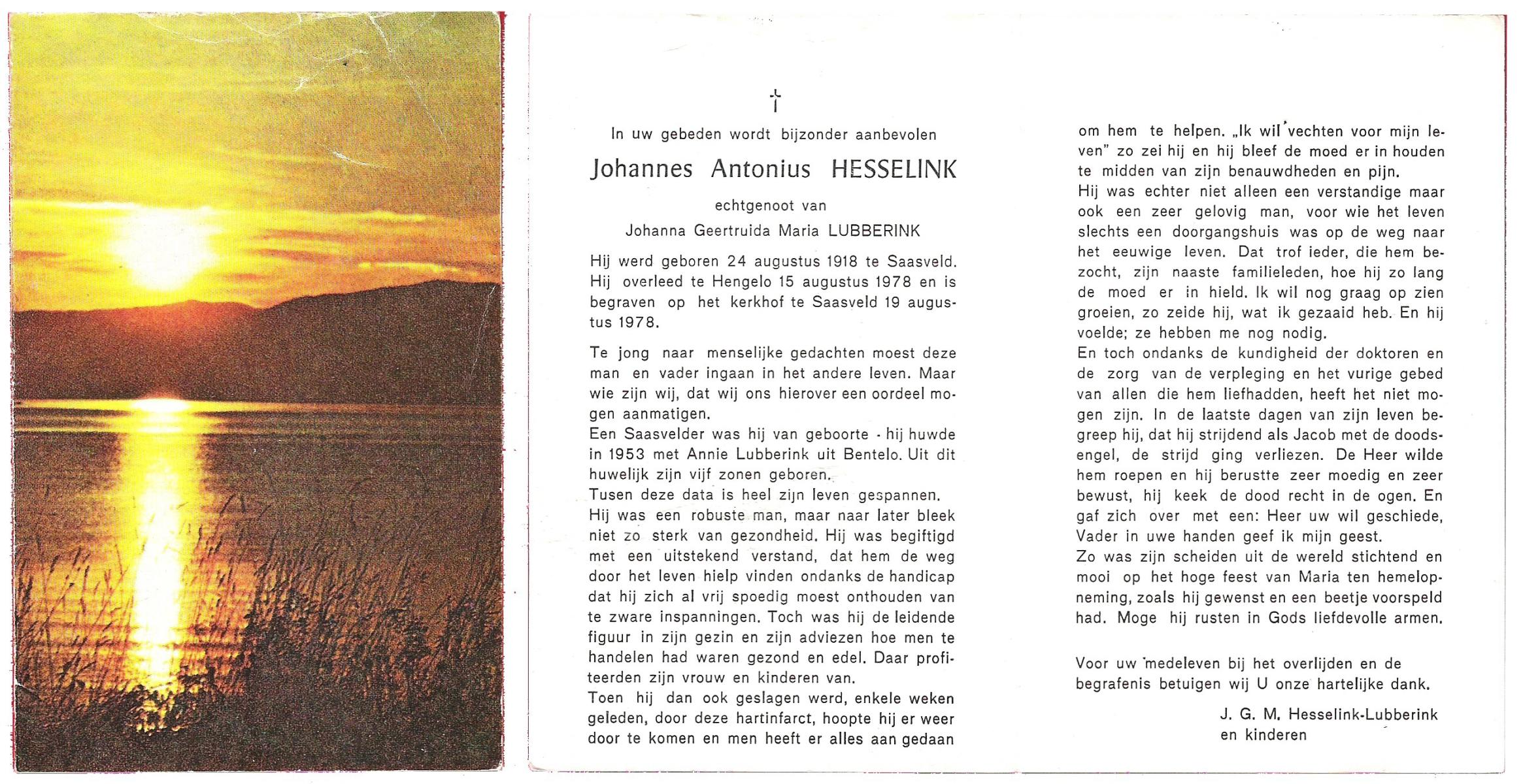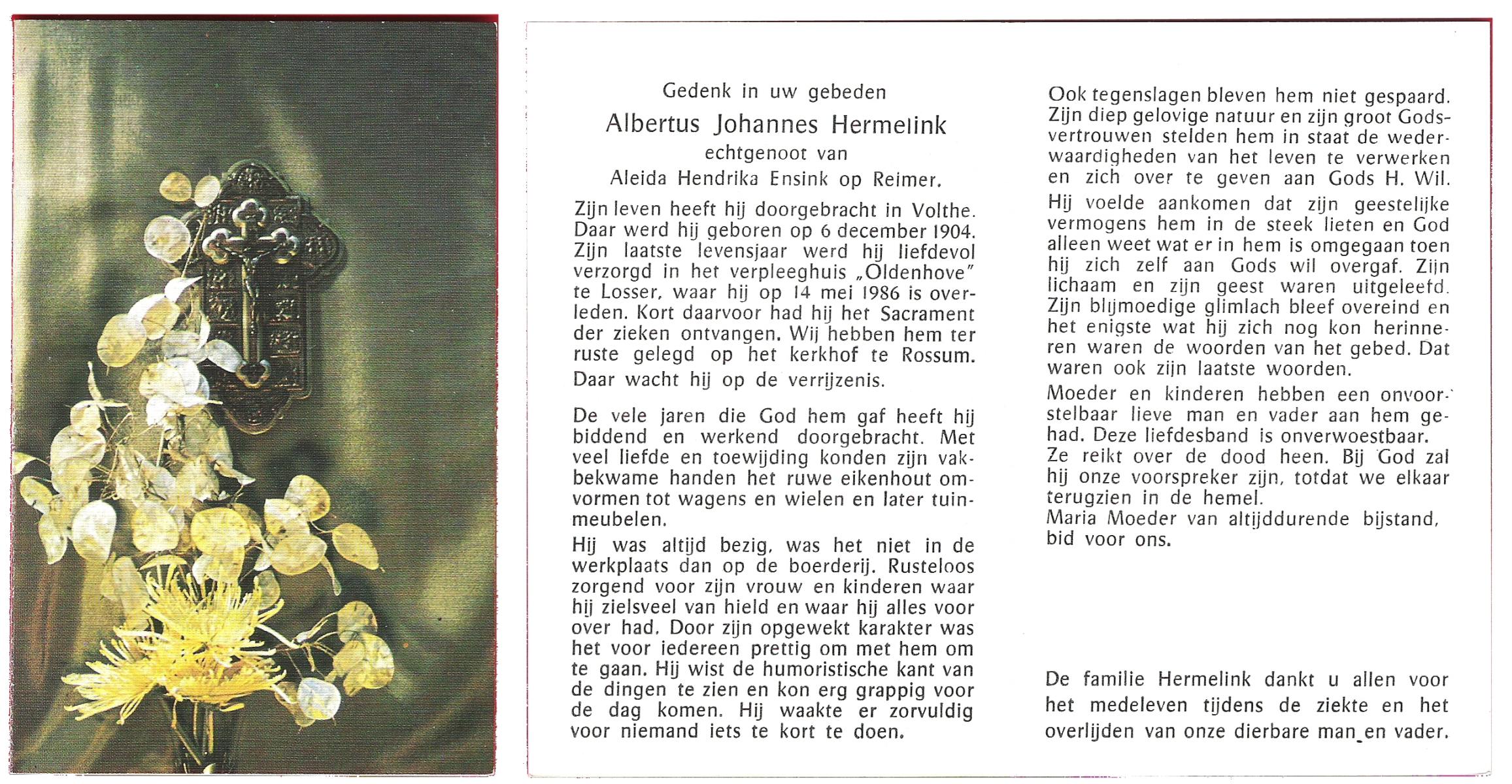 HILDERINK, Johannes Antonius, geboren op 15-4-1914 te Buurse, overleden op 29-3-1986 te Buurse op 71-jarige leeftijd, begraven op 3-4-1986 te Buurse.