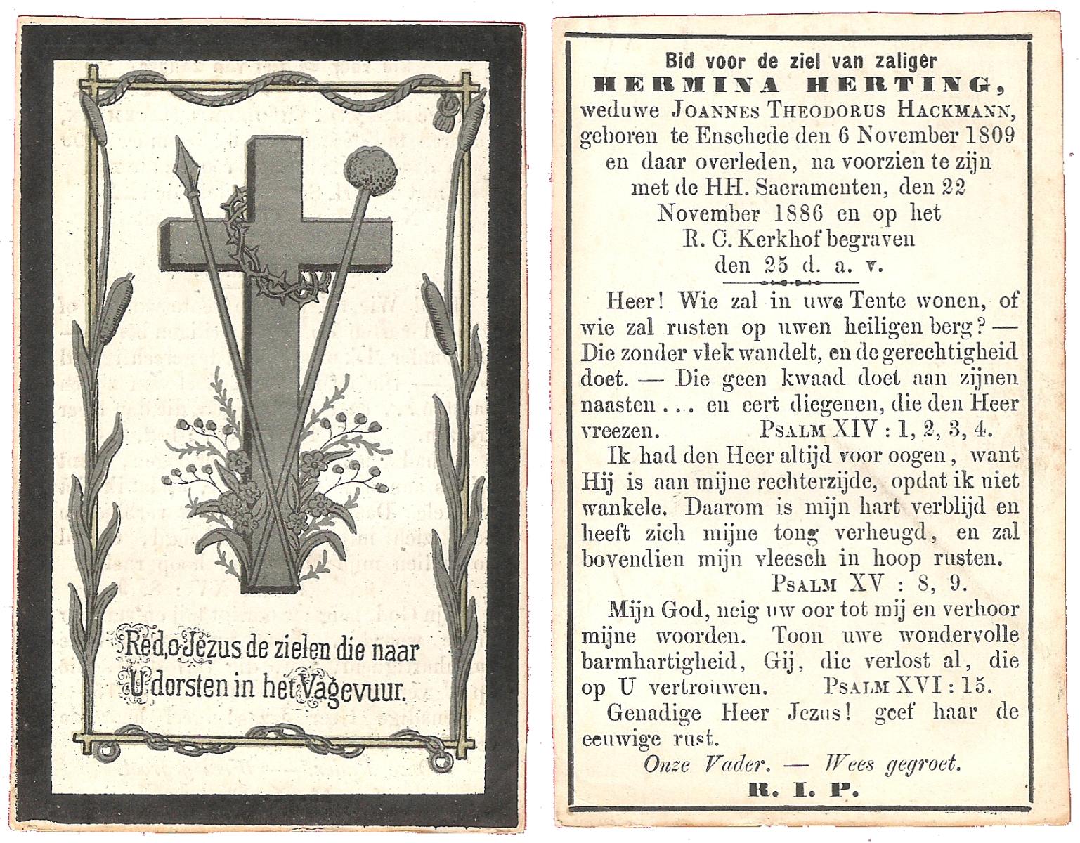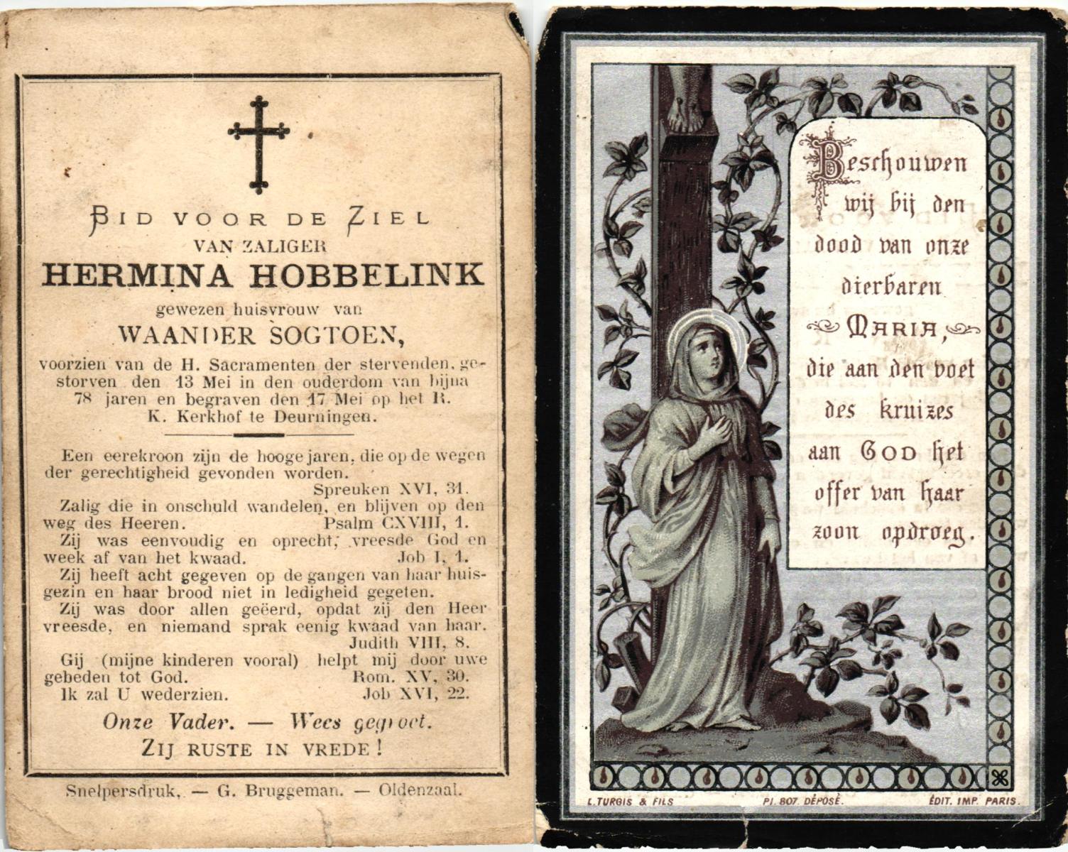 HOBBELINK, Hermina, overleden op 13-05-0001 te Deurningen op 77-jarige leeftijd, begraven op 17-05-0001 te Deurningen.