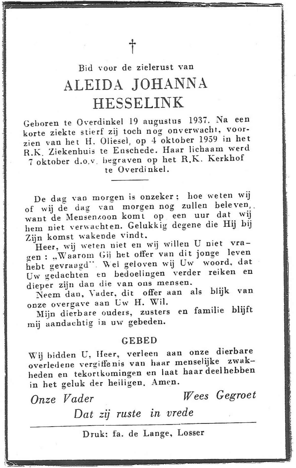 HILGERINK, Aleida Bernardina, geboren op 4-3-1915 te Frensdorf (Dld.), overleden op 10-1-1989 op 73-jarige leeftijd, gecremeerd op 13-1-1989 te Usselo.