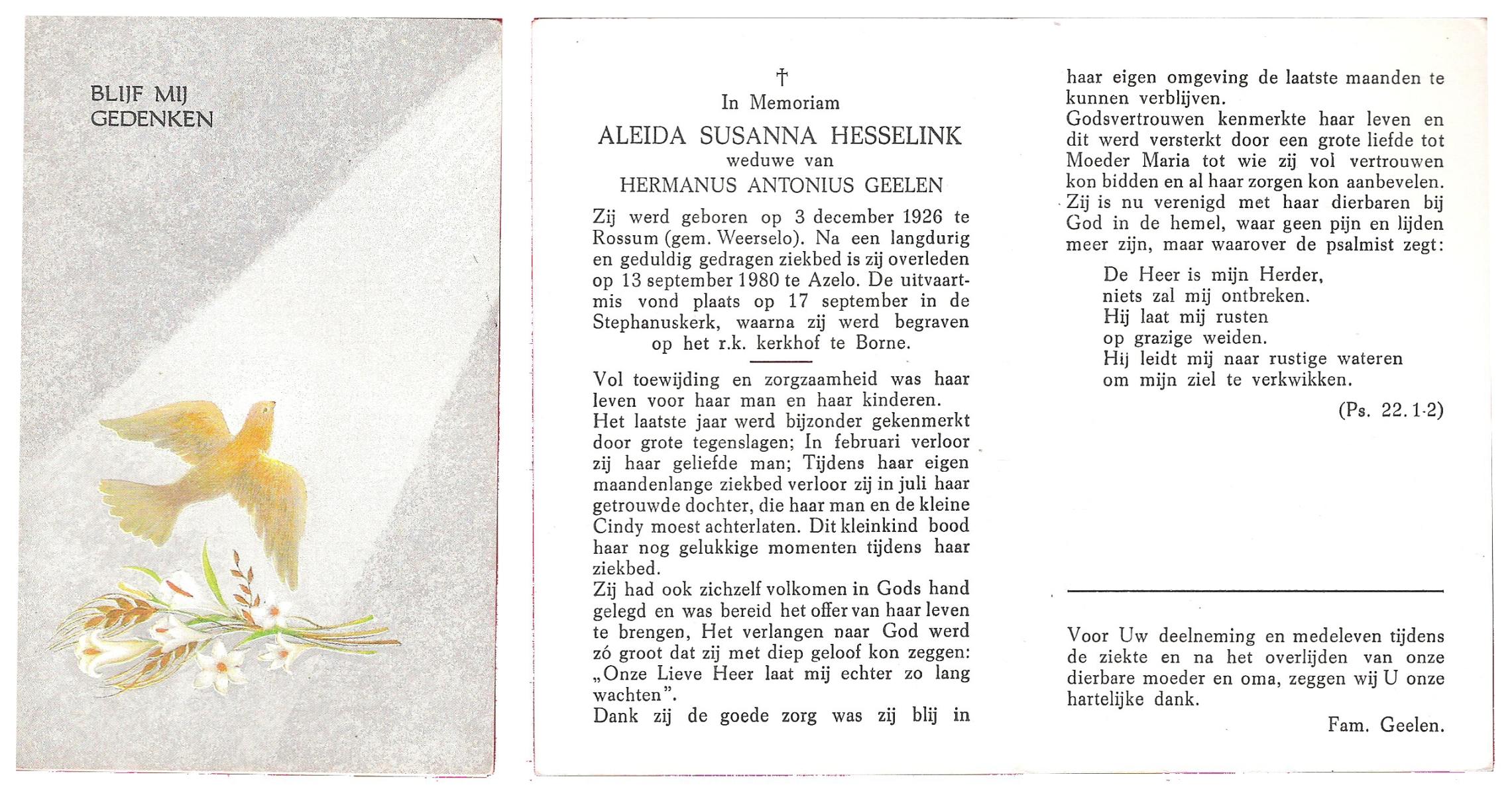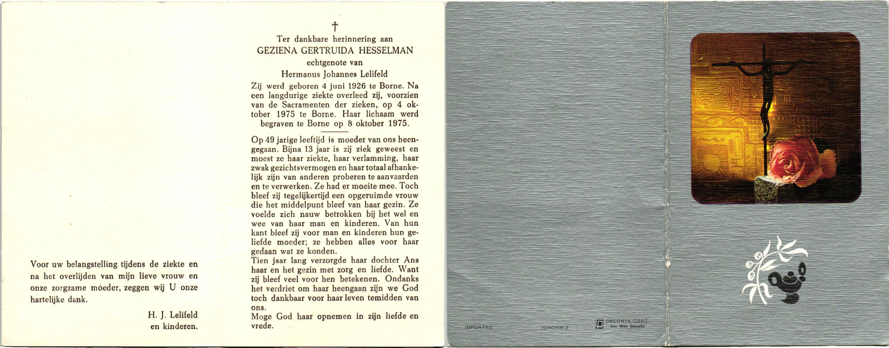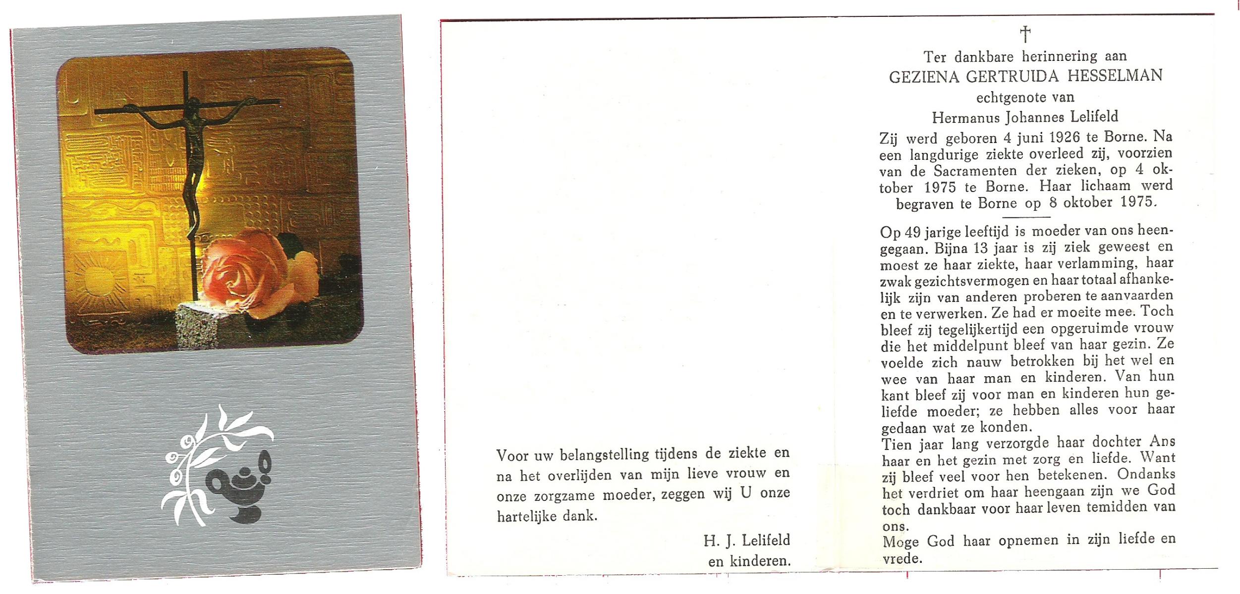 HINDERIKS, Geesje, geboren op 28-12-1922 te Raalte, overleden op 25-8-1976 te Borne op 53-jarige leeftijd, begraven op 28-8-1976 te Borne.