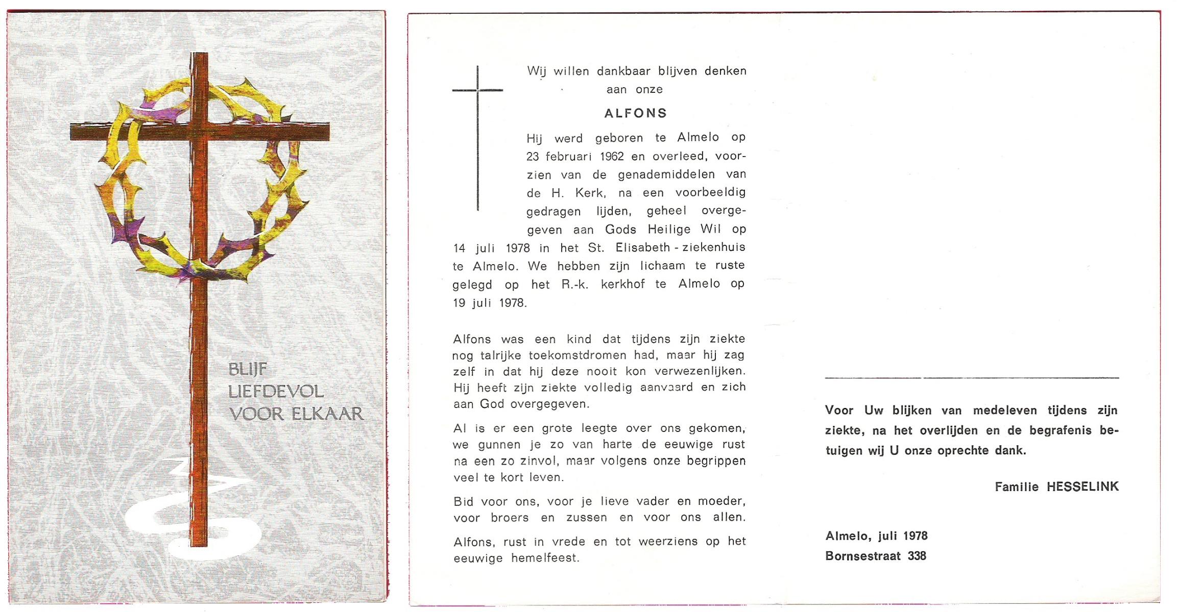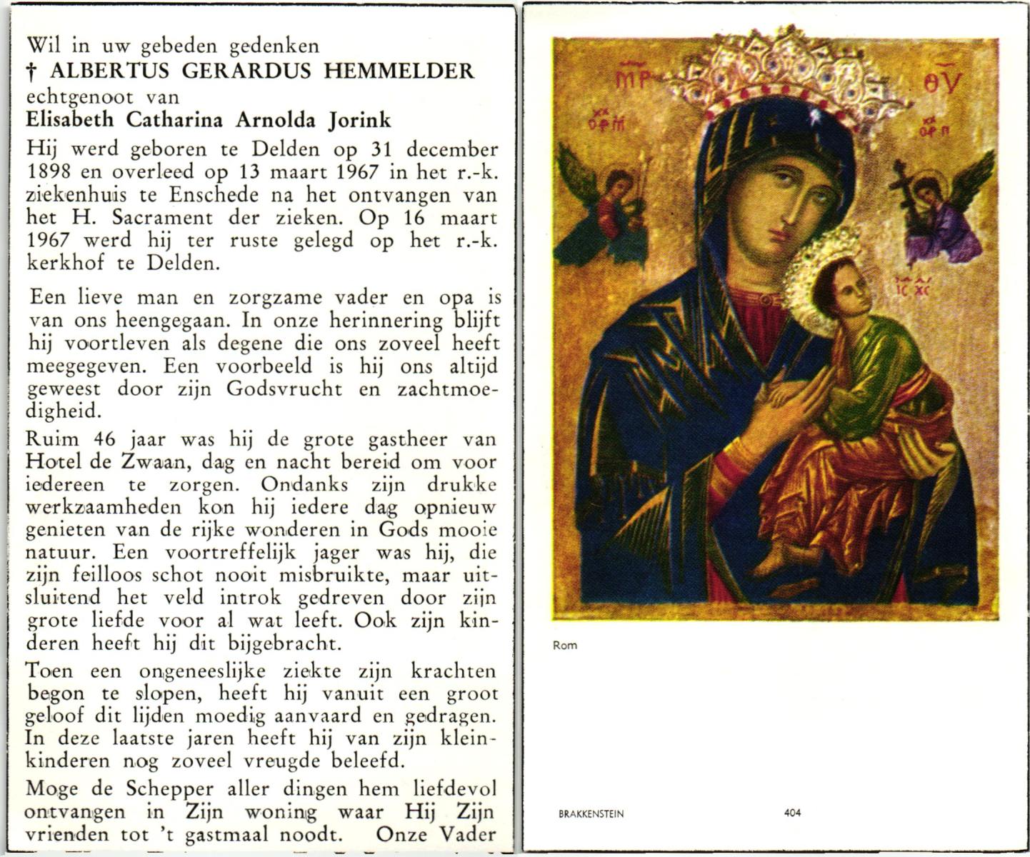 HILGERINK, Johannes Albertus, geboren op 21-01-1889 te Almelo, overleden op 5-9-1966 te Almelo op 77-jarige leeftijd, begraven op 9-9-1966 te Almelo.