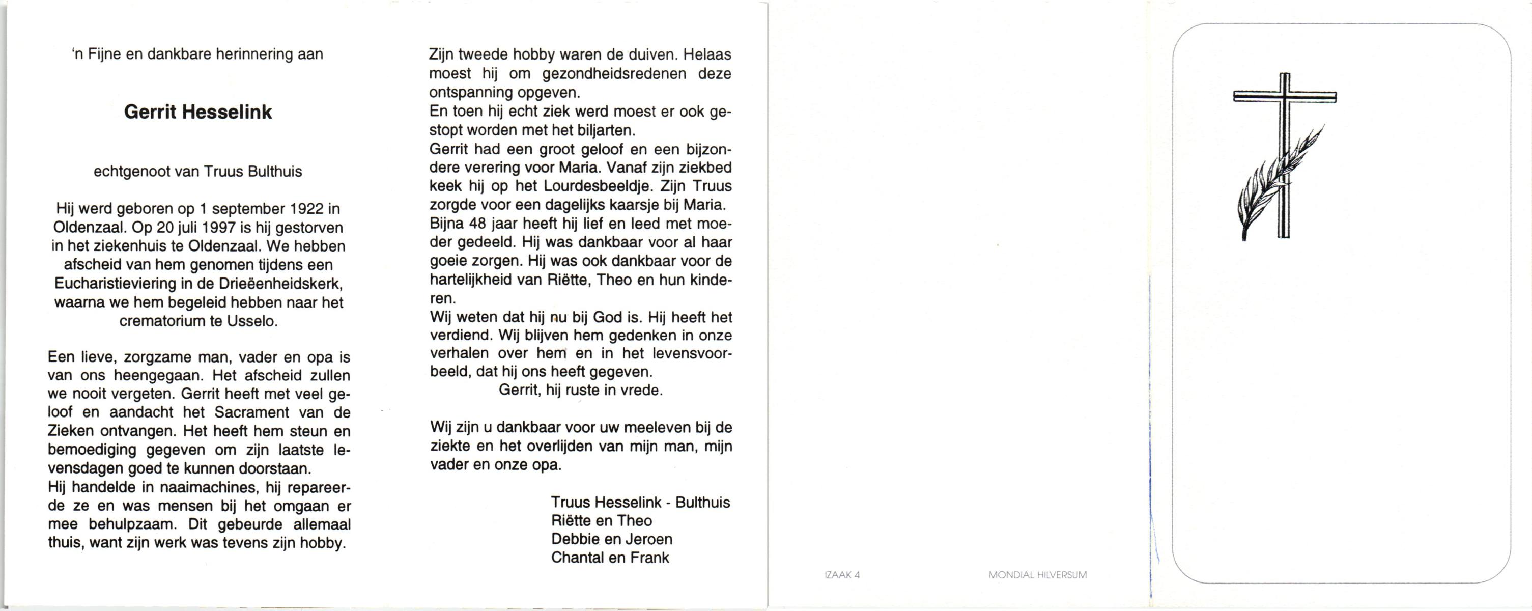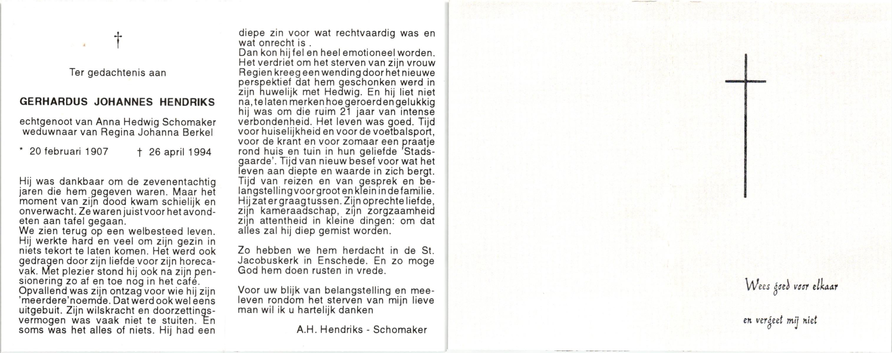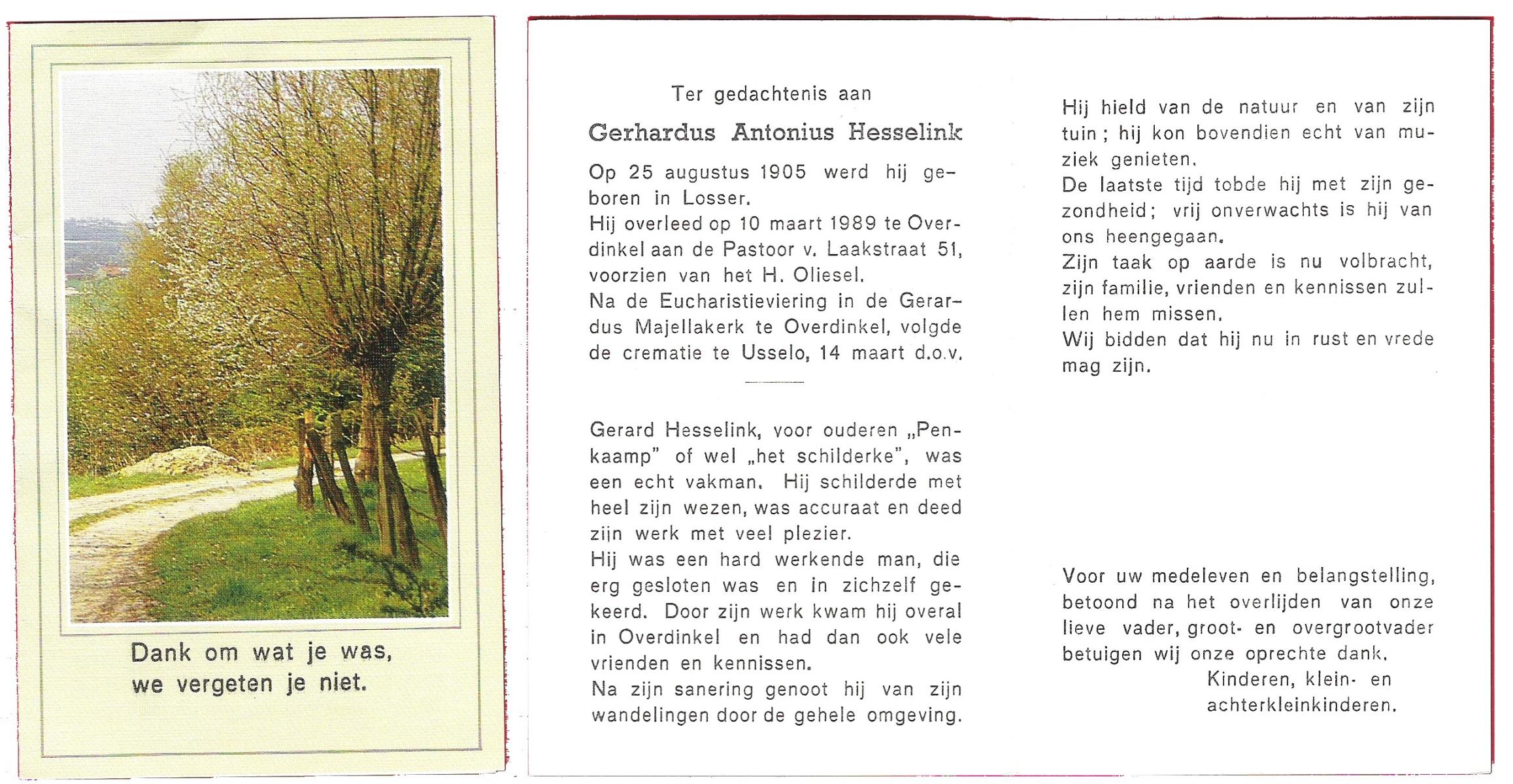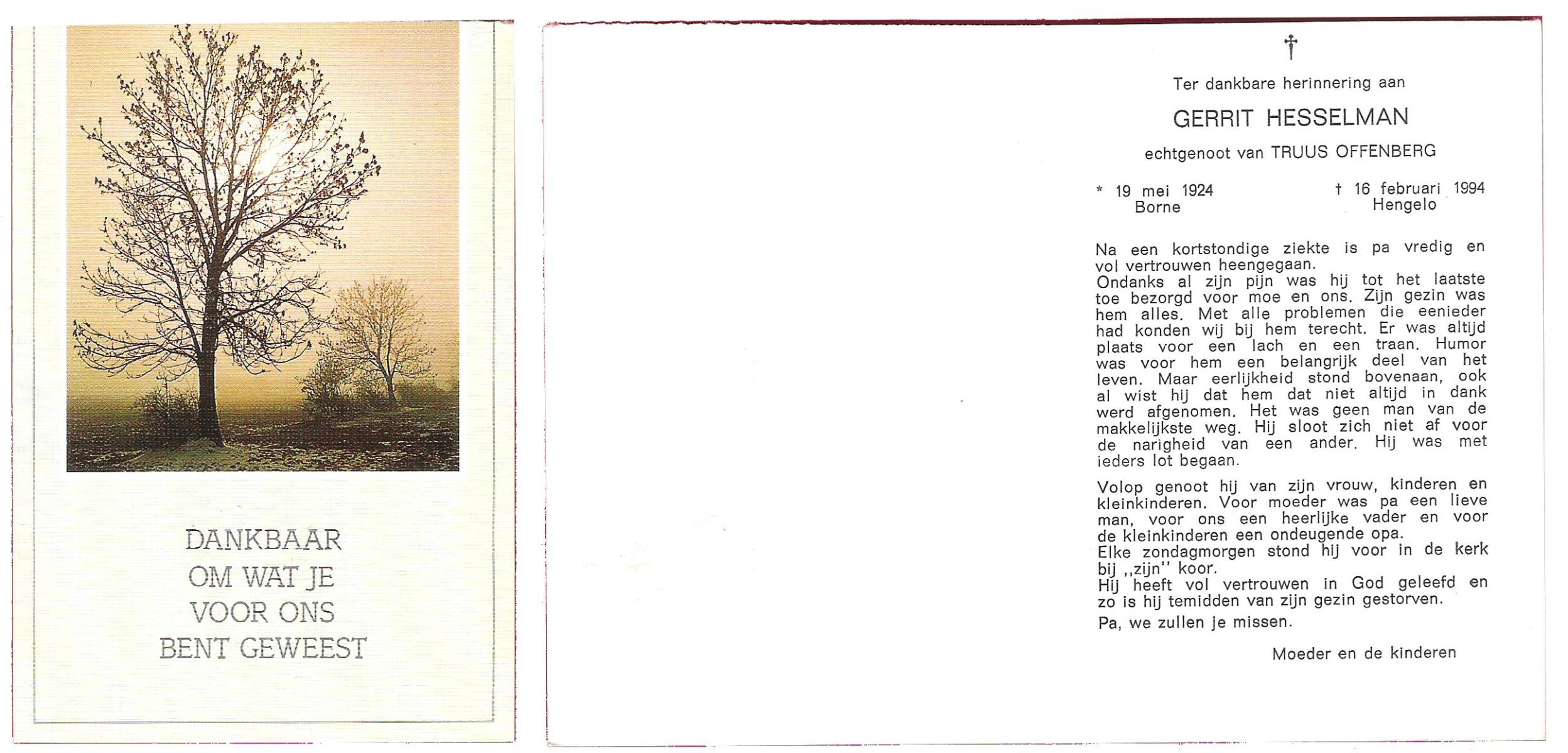 HILGERINK, Gerhardus Johannes, geboren op 17-4-1919 te Almelo, overleden op 22-3-1990 te Enschede op 70-jarige leeftijd, gecremeerd op 26-3-1990 te Usselo.