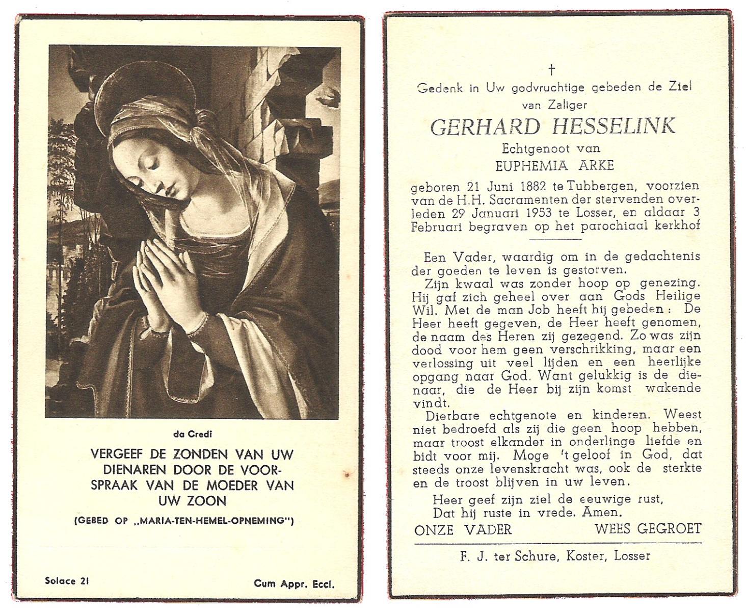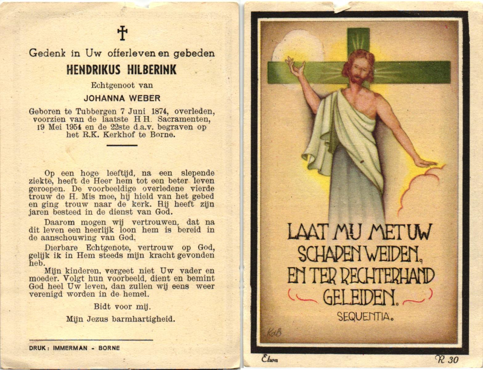 HILBERINK, , Hendrikus, geboren op 07-06-1874 te Tubbergen, overleden op 19-5-1954 op 79-jarige leeftijd, begraven op 22-5-1954 te Borne.