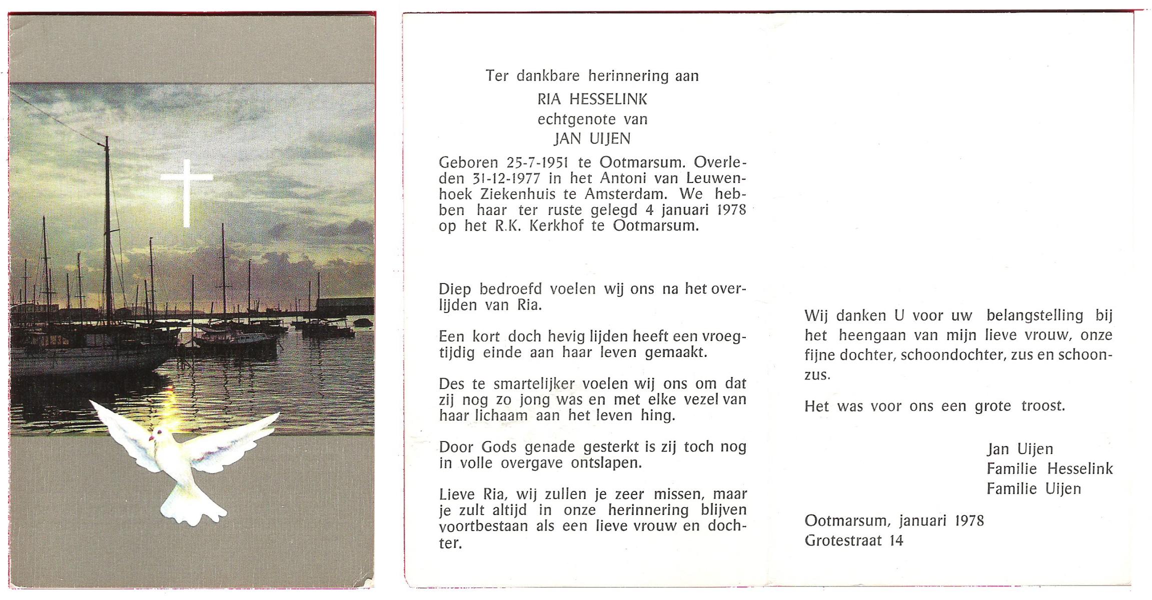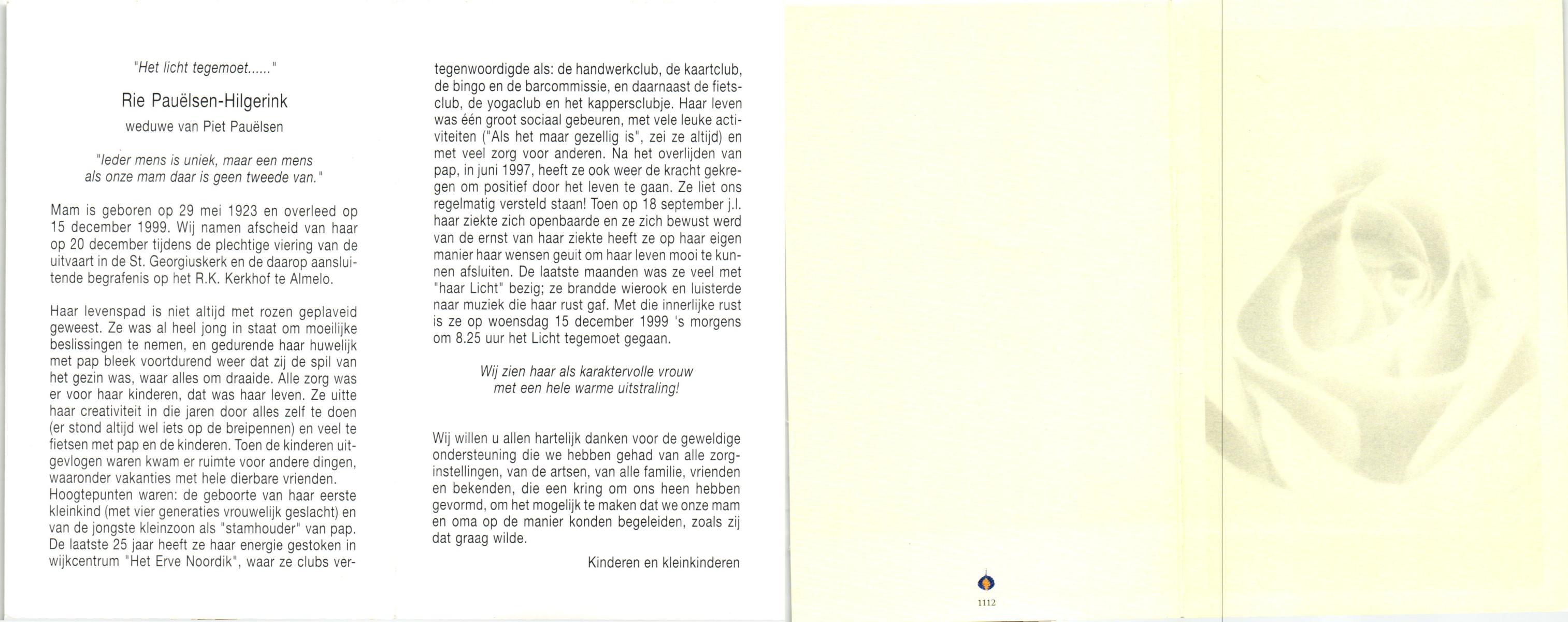 HILGERINK, Ria, geboren op 29-5-1923, overleden op 15-12-1999 op 76-jarige leeftijd, begraven op 20-12-1999 te Almelo.