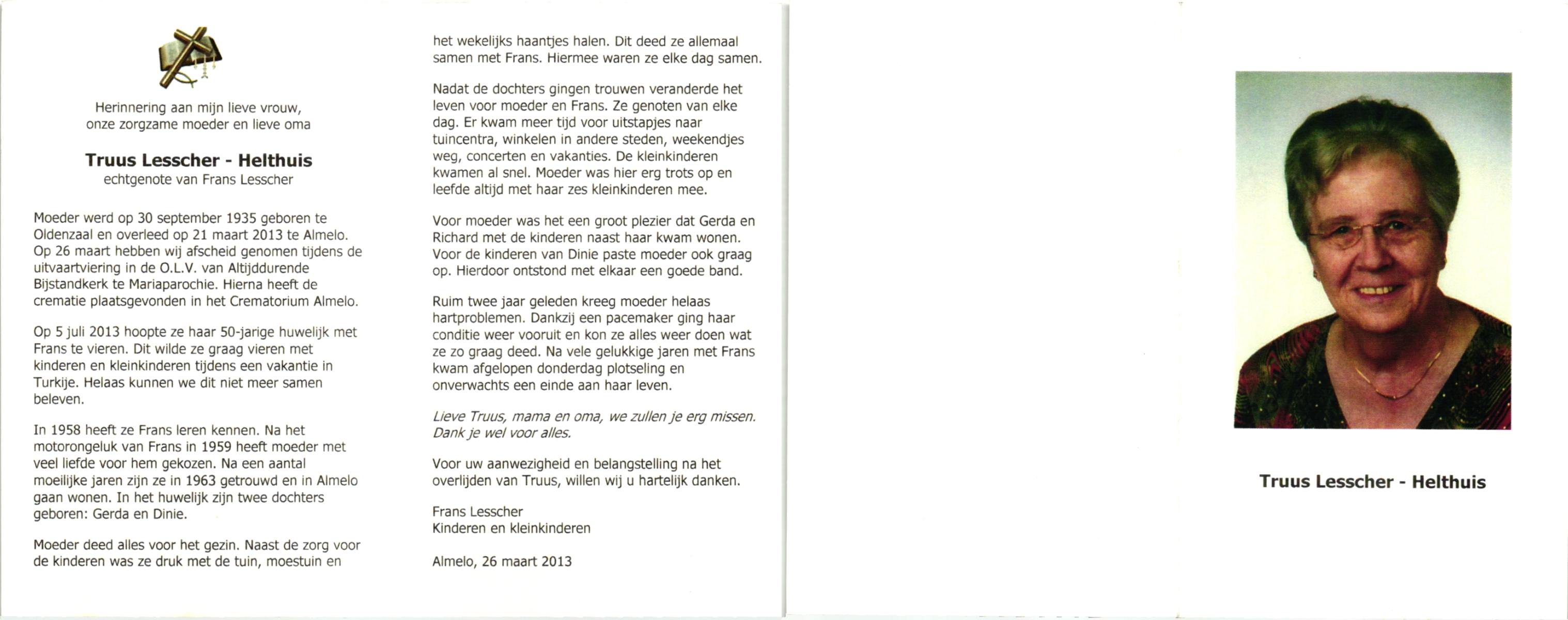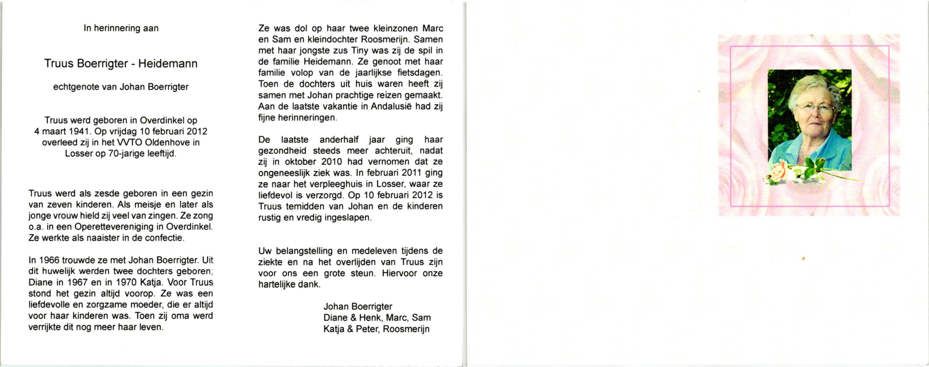 HEIDEMANN, , Truus, geboren op 4-3-1941 te Overdinkel, overleden op 10-2-2012 te Losser op 70-jarige leeftijd.