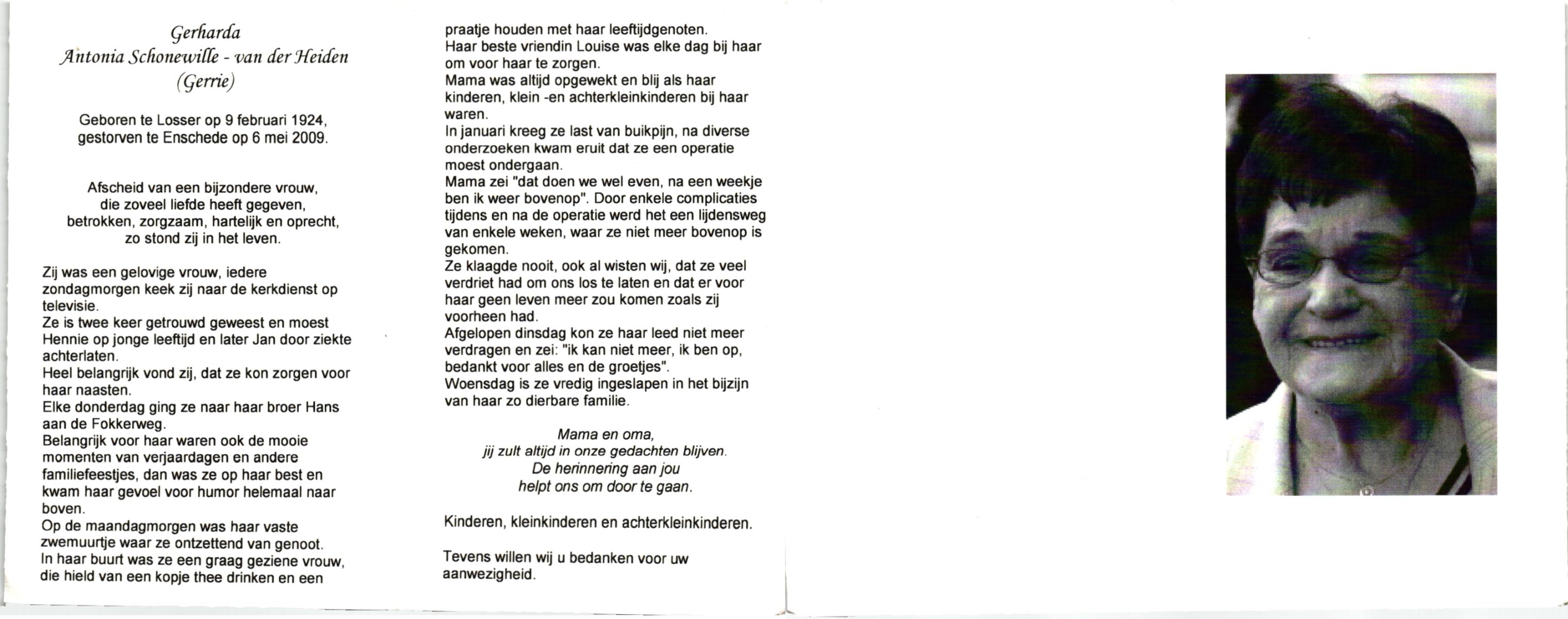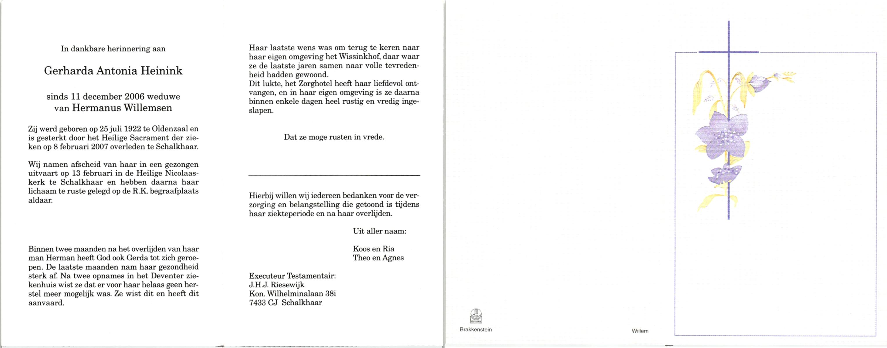 HEININK, , Gerharda Antonia, geboren op 25-7-1922 te Oldenzaal, overleden op 8-2-2007 te Schalkhaar op 84-jarige leeftijd, begraven op 13-2-2007 te Schalkhaar.