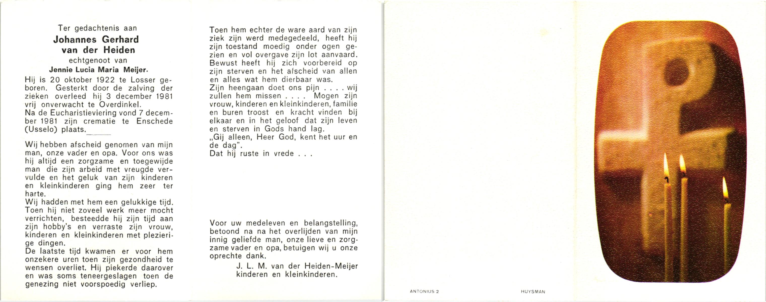 HEIDEN, van, Johannes Gerhard, geboren op 20-10-1922 te Losser, overleden op 3-12-1981 te Overdinkel op 59-jarige leeftijd, gecremeerd op 7-12-1981 te Usselo.