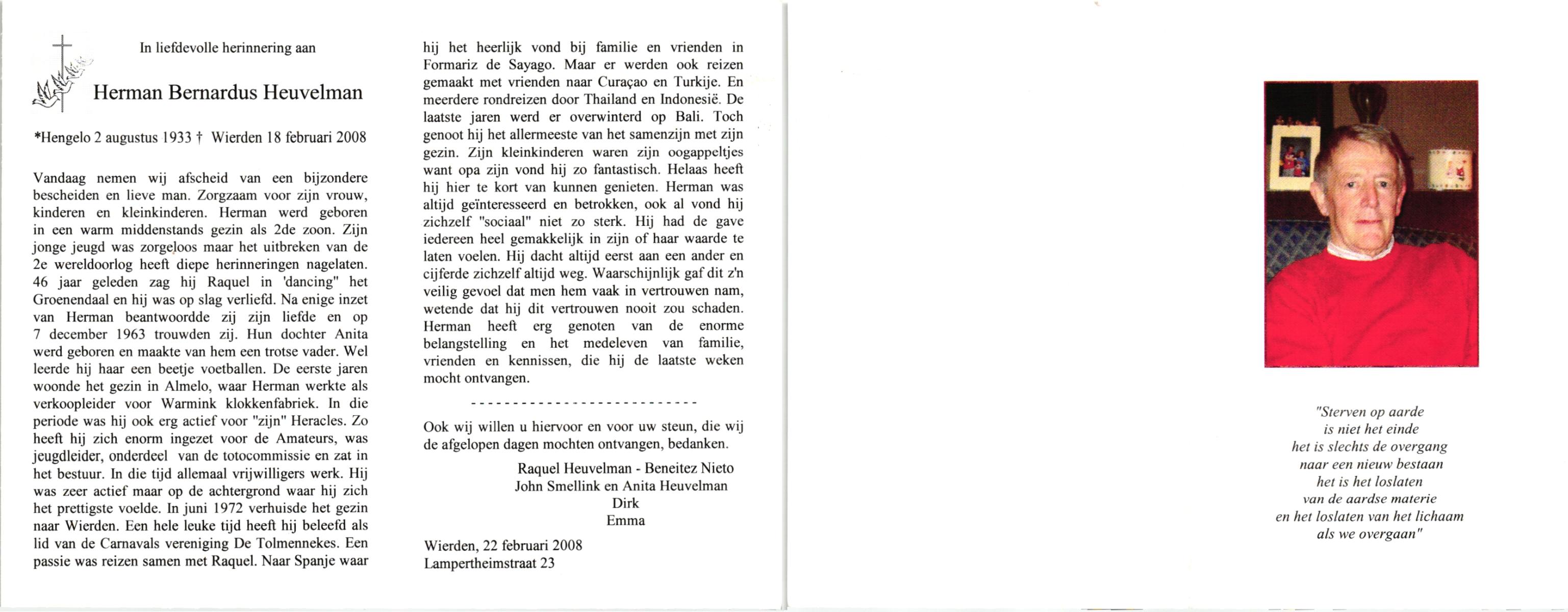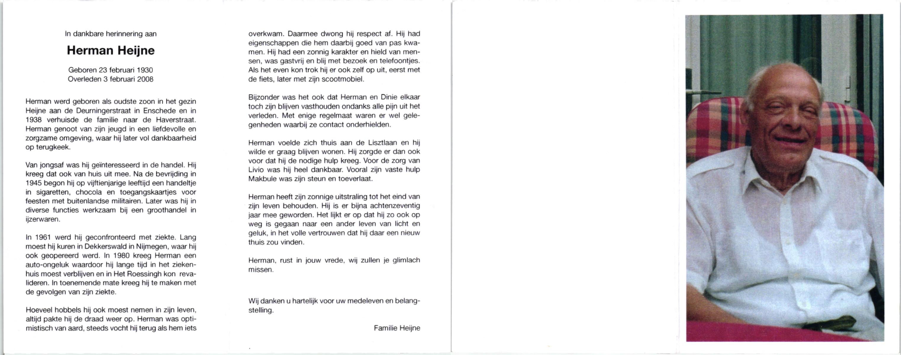 HEIJNE, , Herman, geboren op 23-2-1930 te Enschede, overleden op 3-2-2008 te Enschede op 77-jarige leeftijd.