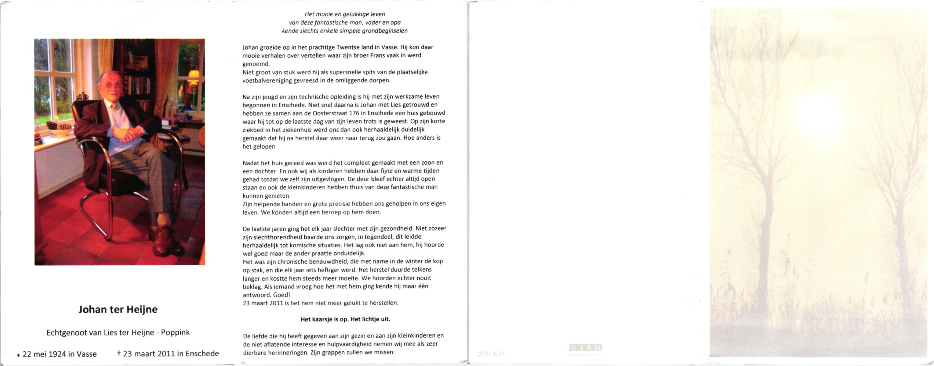 HEIJNE, ter, Johan, geboren op 22-5-1924 te Vasse, overleden op 23-3-2011 te Enschede op 86-jarige leeftijd.