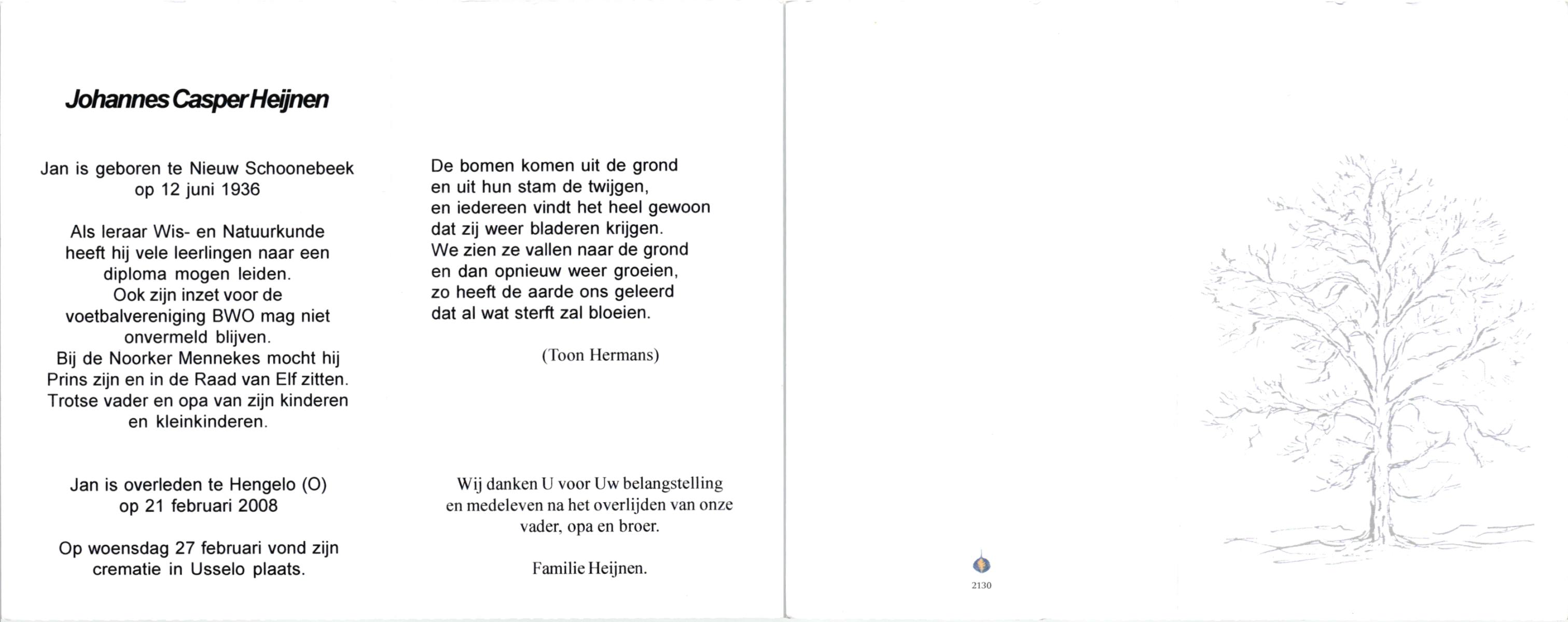 HEIJNEN, , Johannes Casper, geboren op 12-6-1936 te Nieuw-Schoonebeek, overleden op 21-2-2008 te Hengelo (O) op 71-jarige leeftijd, gecremeerd op 27-2-2008 te Usselo.