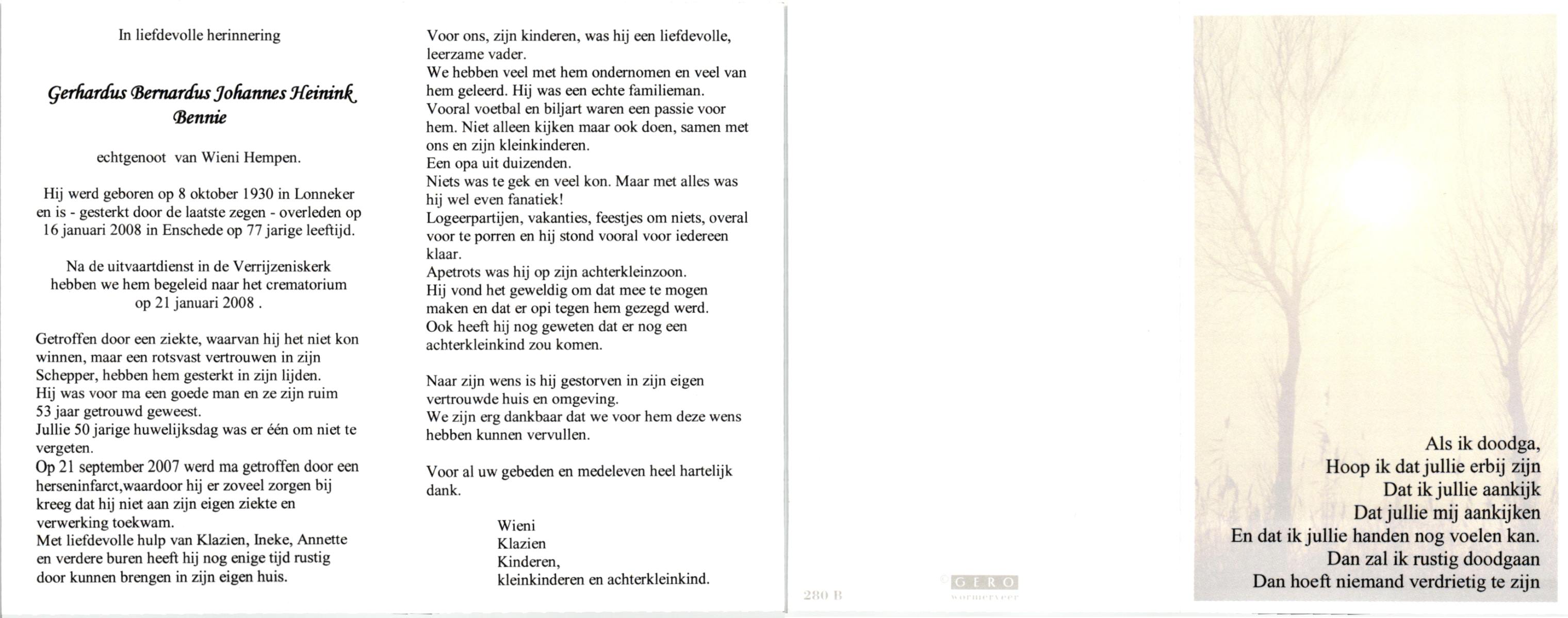 HEININK, , Gerhardus Bernardus Johannes, geboren op 8-10-1930 te Lonneker, overleden op 16-1-2008 te Enschede op 77-jarige leeftijd, gecremeerd op 21-1-2008 te Usselo.
