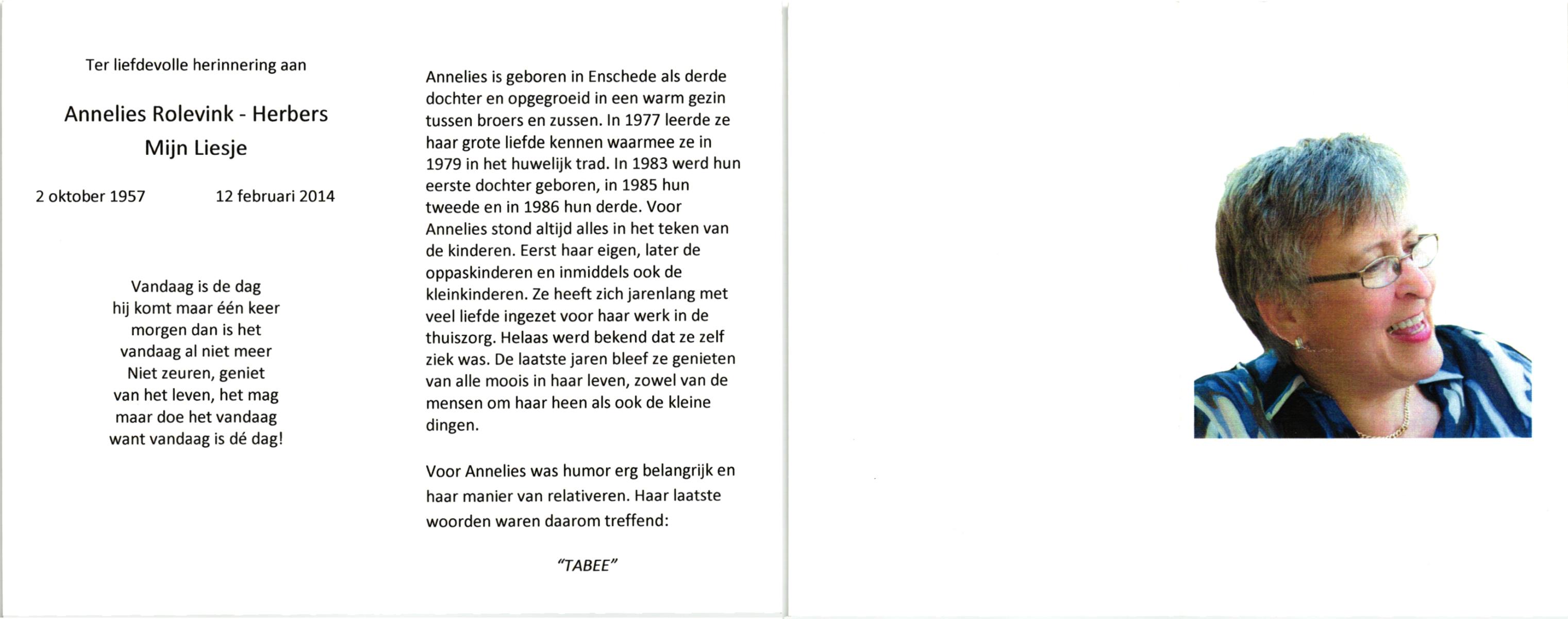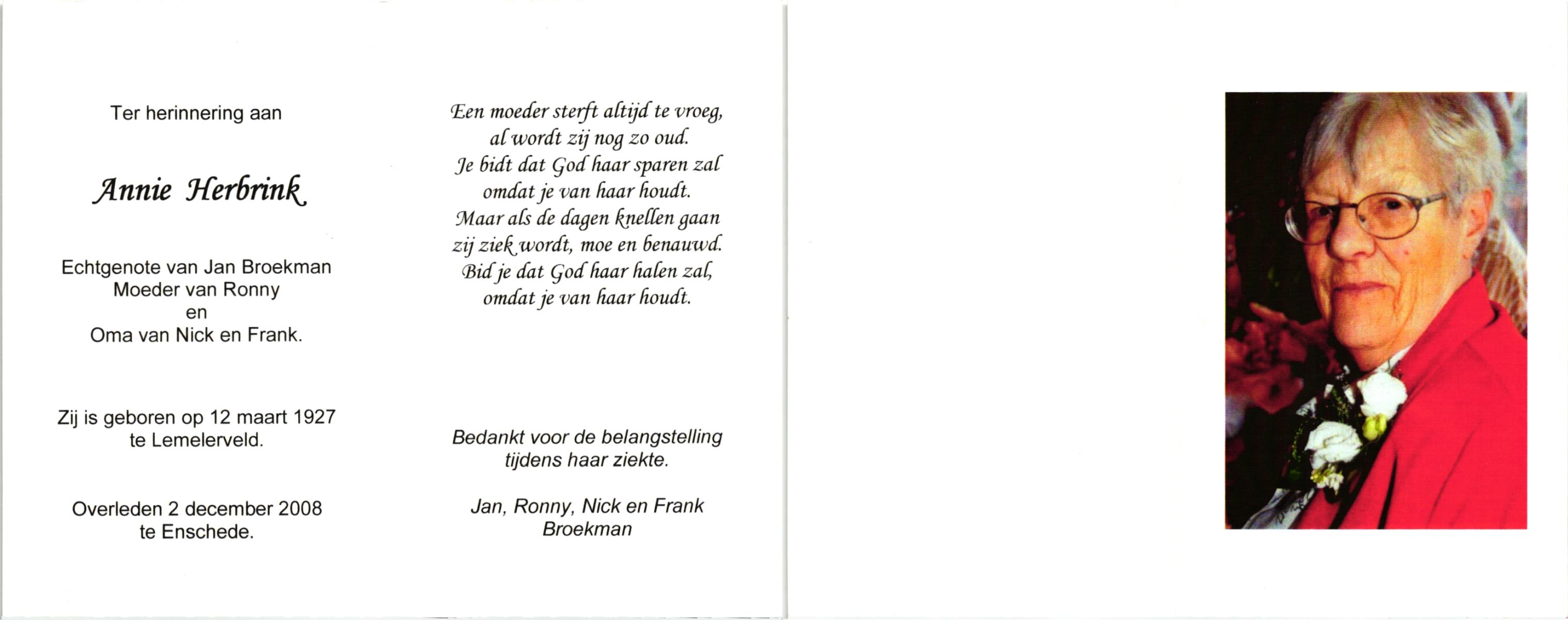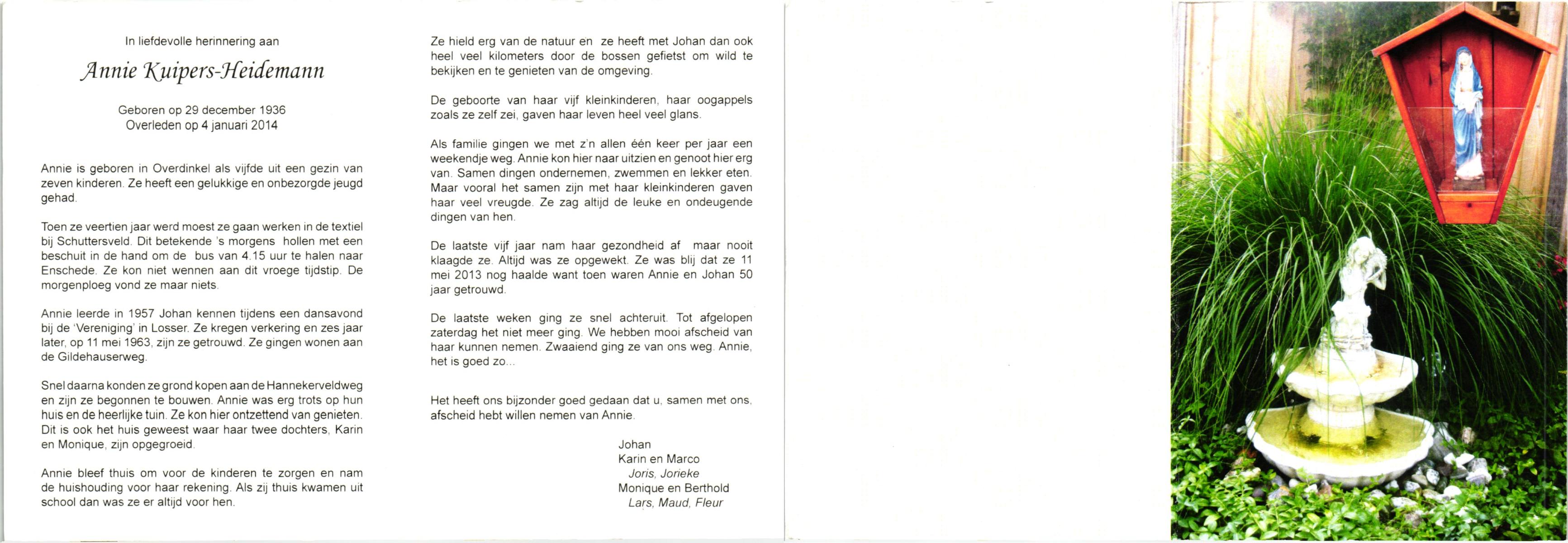 HEIDEMANN, Annie, geboren op 29-12-1936 te Overdinkel, overleden op 4-1-2014 te Overdinkel op 77-jarige leeftijd.