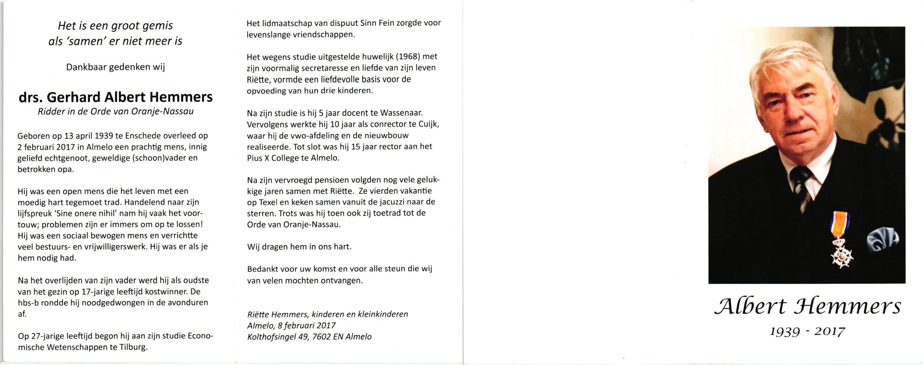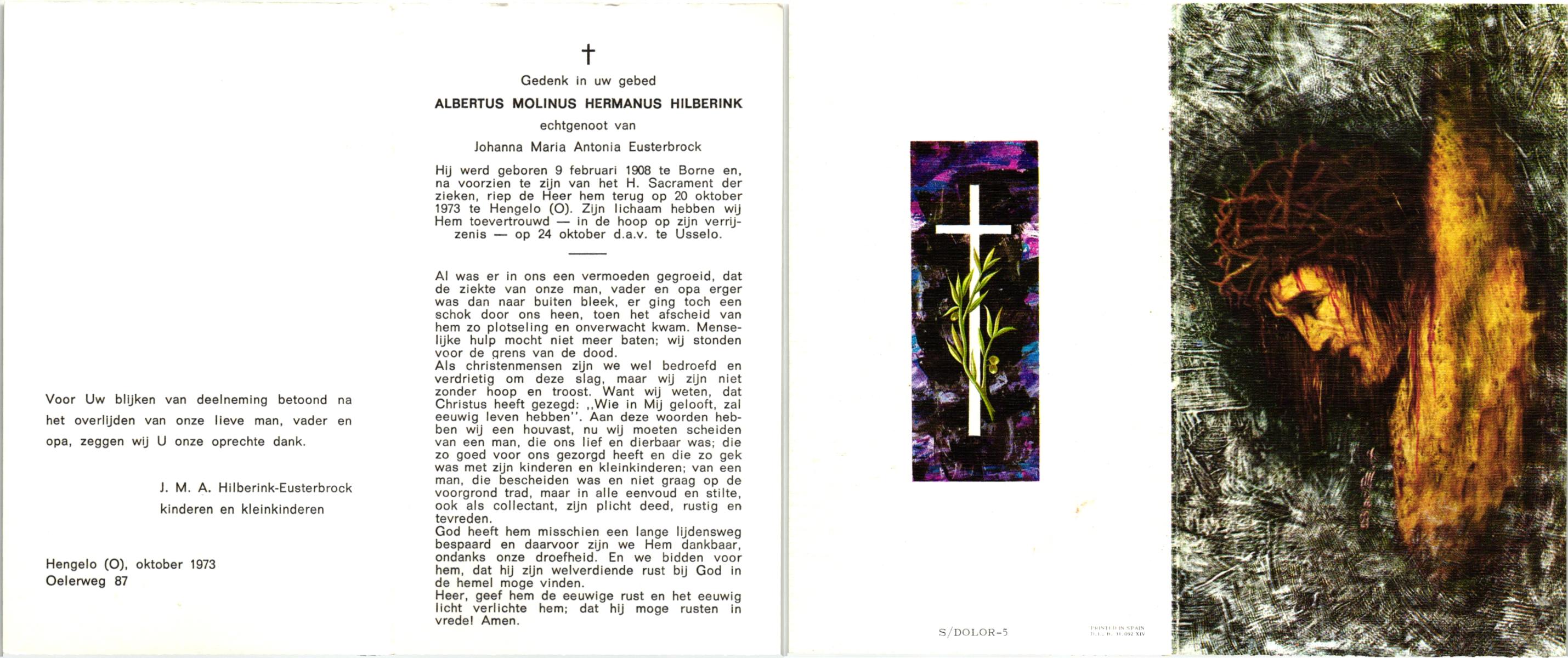 HILBERINK, , Albertus Molinus Hermanus, geboren op 9-2-1908 te Borne, overleden op 20-10-1973 te Hengelo (O) op 65-jarige leeftijd, gecremeerd op 24-10-1973 te Usselo.