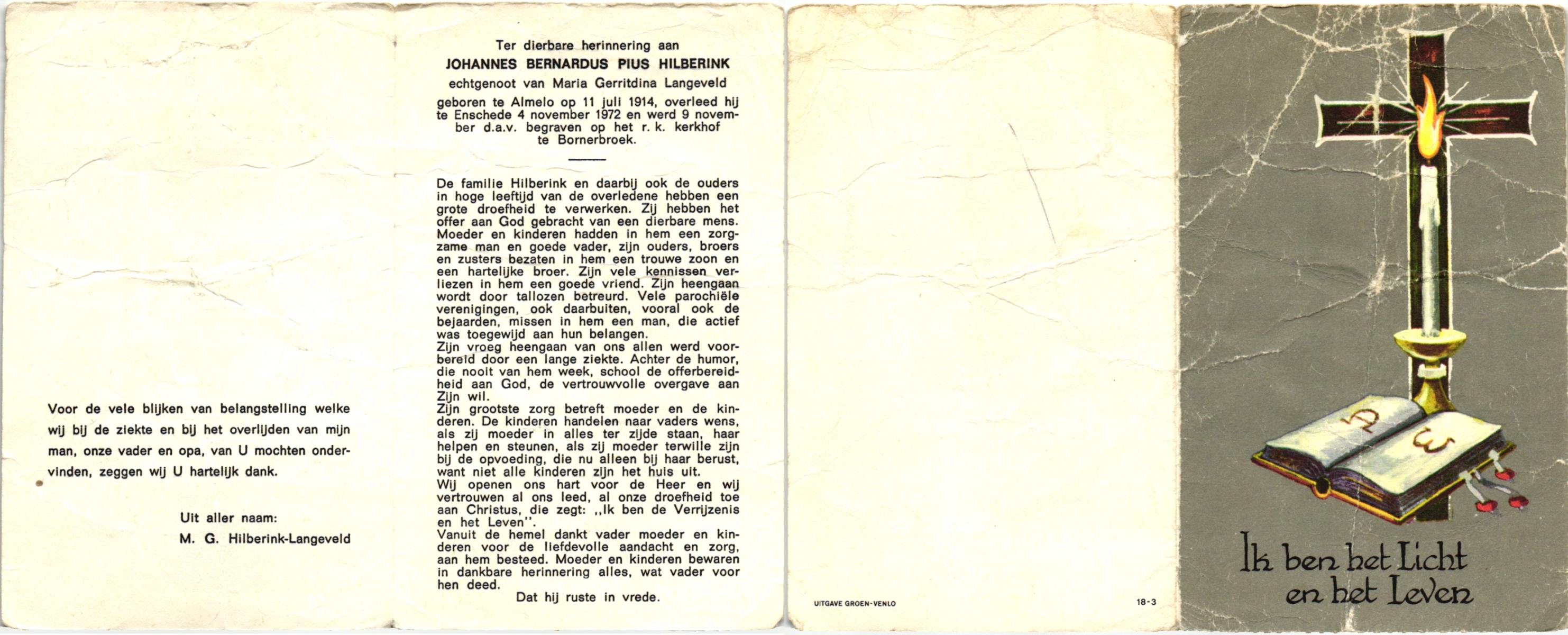 HILBERINK, , Johannes Bernardus Pius, geboren op 11-7-1914 te Almelo, overleden op 4-11-1972 te Enschede op 58-jarige leeftijd, begraven op 9-11-1972 te Bornerbroek.