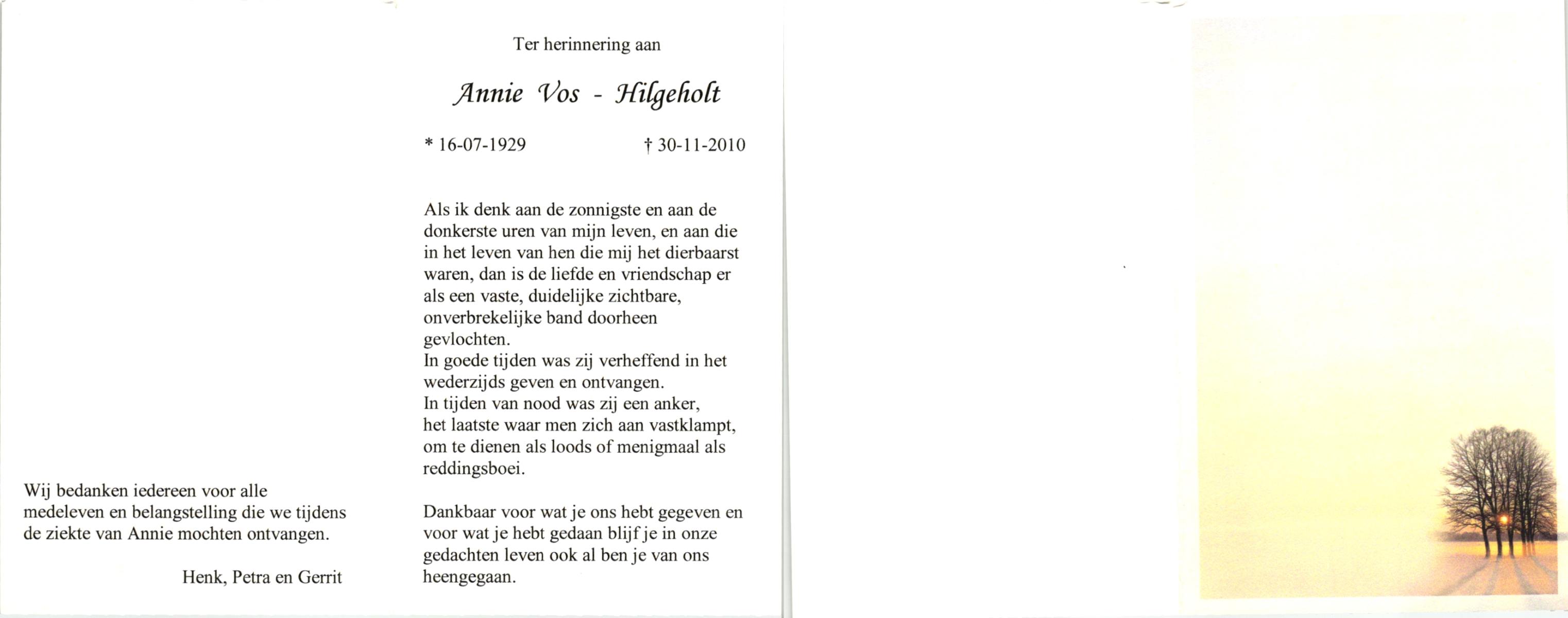 HILGEHOLT, , Annie, geboren op 16-7-1929, overleden op 30-11-2010 op 81-jarige leeftijd.