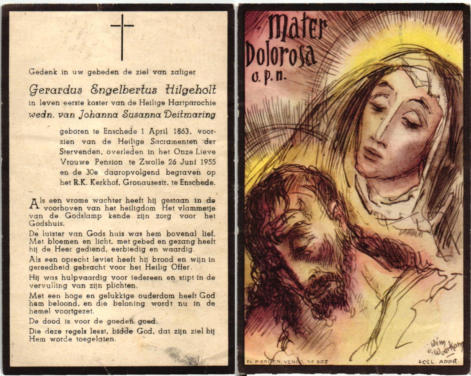 HILGEHOLT, , Gerardus Engelbertus, geboren op 01-04-1863 te Enschede, overleden op 26-6-1955 te Zwolle op 92-jarige leeftijd, begraven op 30-6-1955 te Enschede.