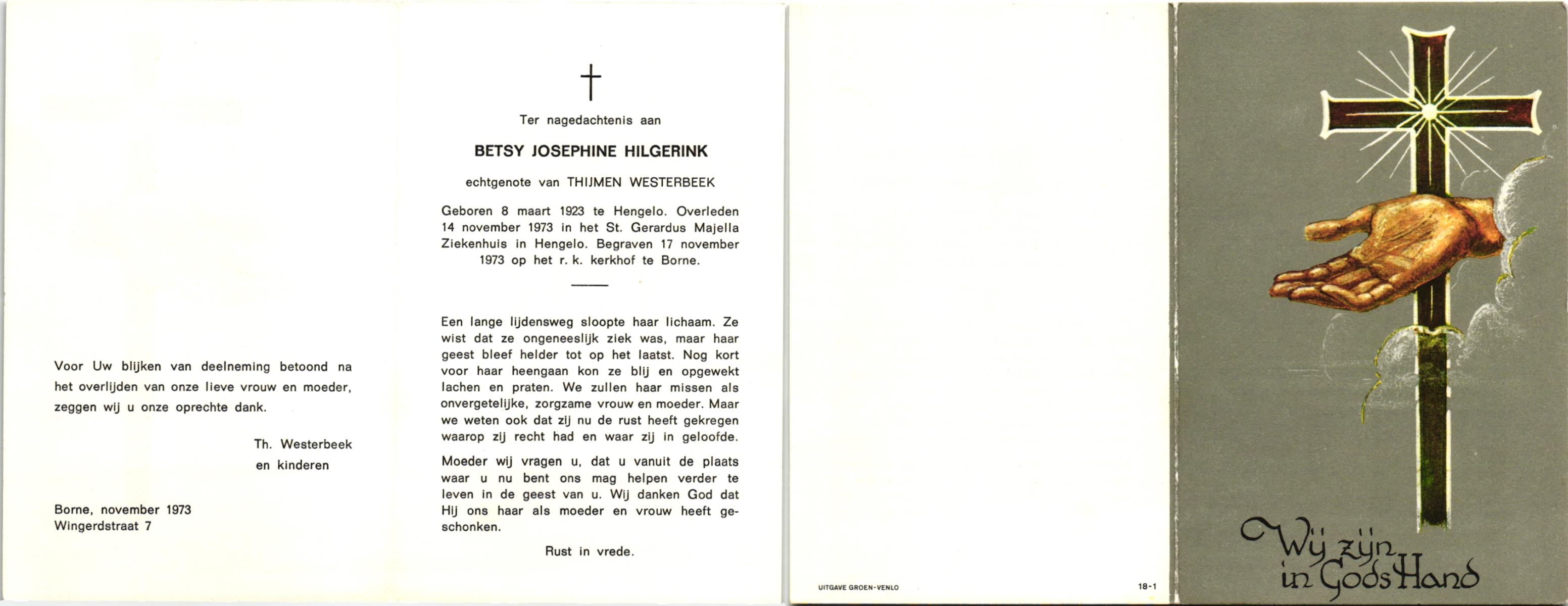 HILGERINK, , Betsy Josephine, geboren op 8-3-1923 te Hengelo (O), overleden op 14-11-1973 te Hengelo (O) op 50-jarige leeftijd, begraven op 17-11-1973 te Borne.