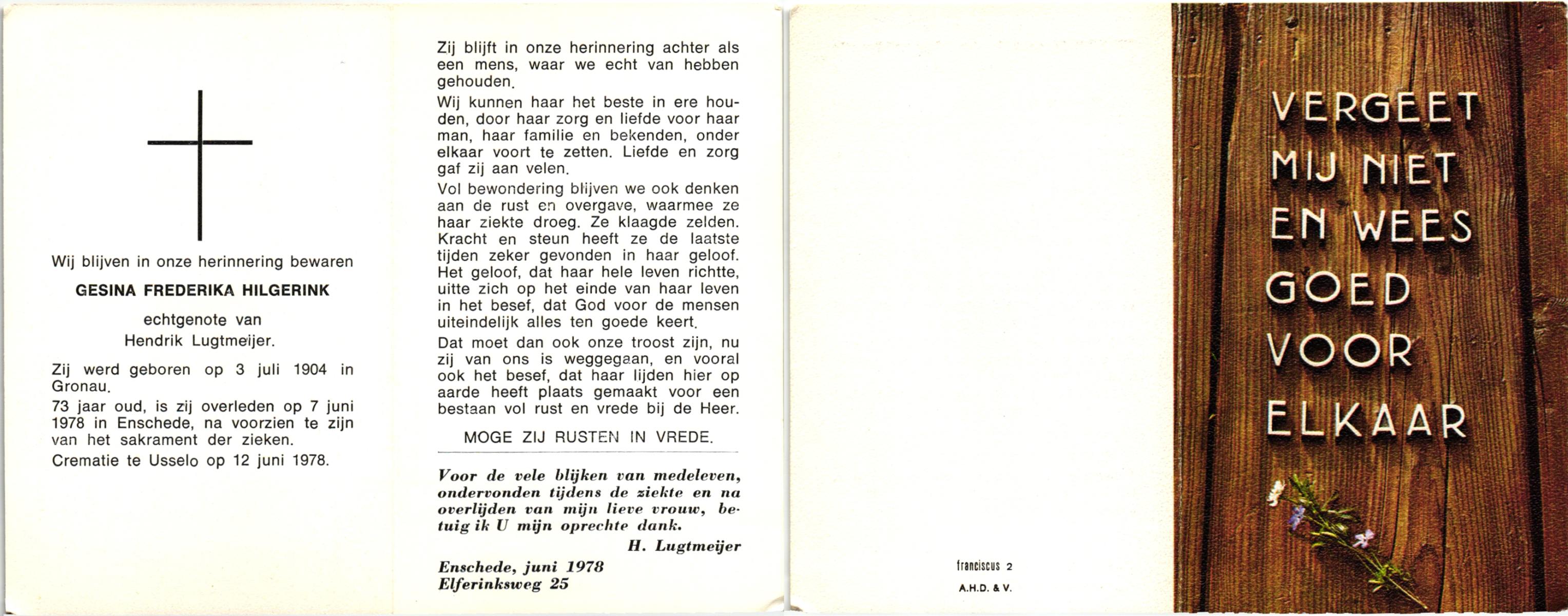 HILGERINK, , Gesina Frederika, geboren op 3-7-1904 te Gronau, Dld, overleden op 7-6-1978 te Enschede op 73-jarige leeftijd, gecremeerd op 12-6-1978 te Usselo.