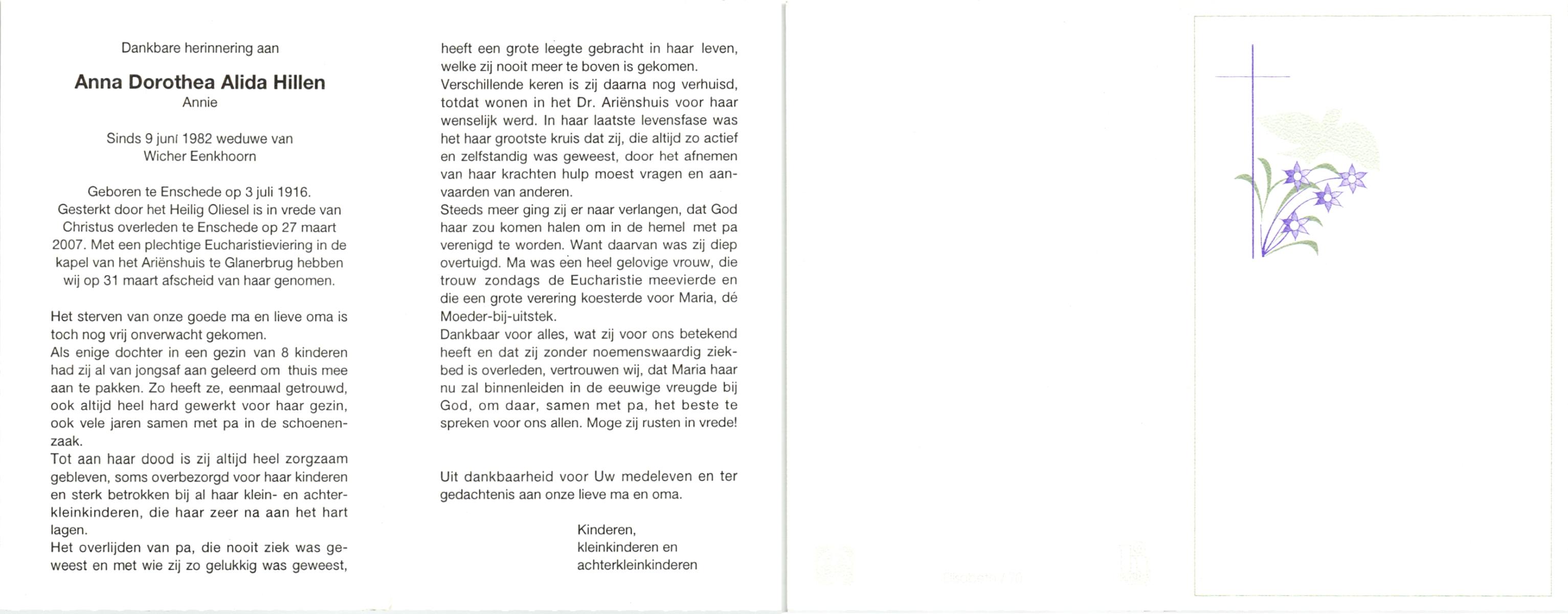 HILLEN, Christina Johanna, geboren op 20-01-1895 te Hengelo (O), overleden op 3-8-1932 te Almelo op 37-jarige leeftijd, begraven op 6-8-1932 te Almelo.