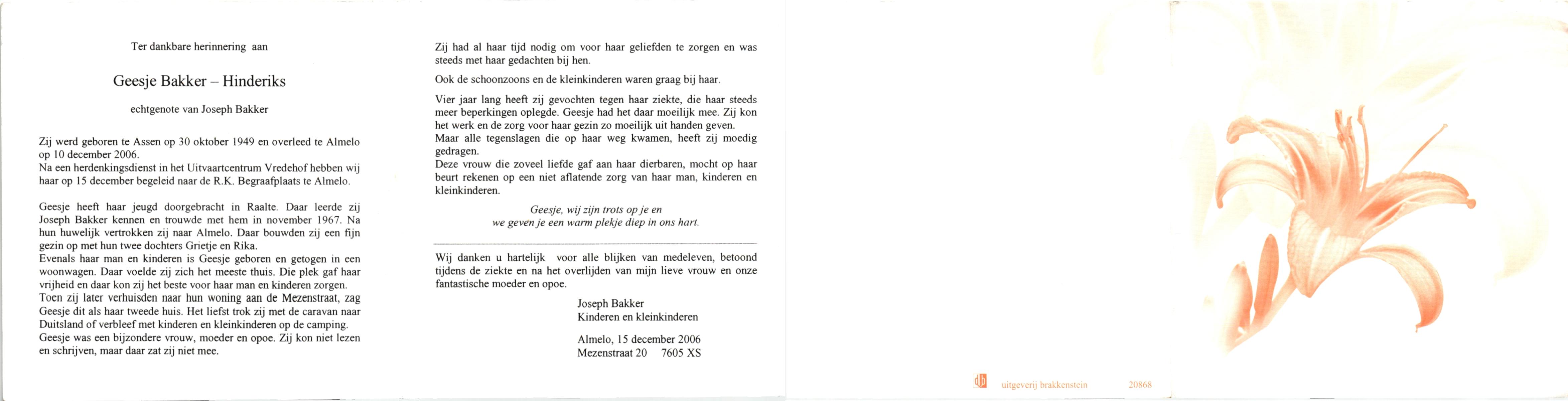 HINDERIKS, , Geesje, geboren op 30-10-1949 te Assen, overleden op 10-12-2006 te Almelo op 57-jarige leeftijd, begraven op 15-12-2006 te Almelo, rk.