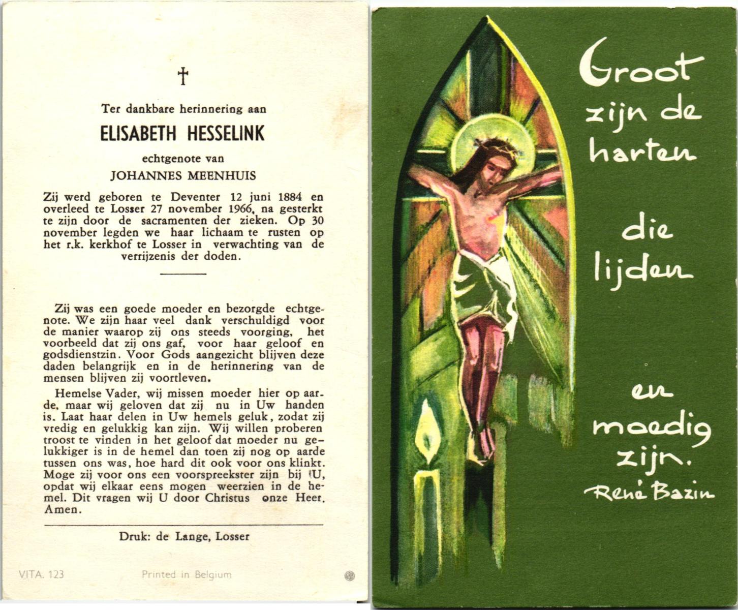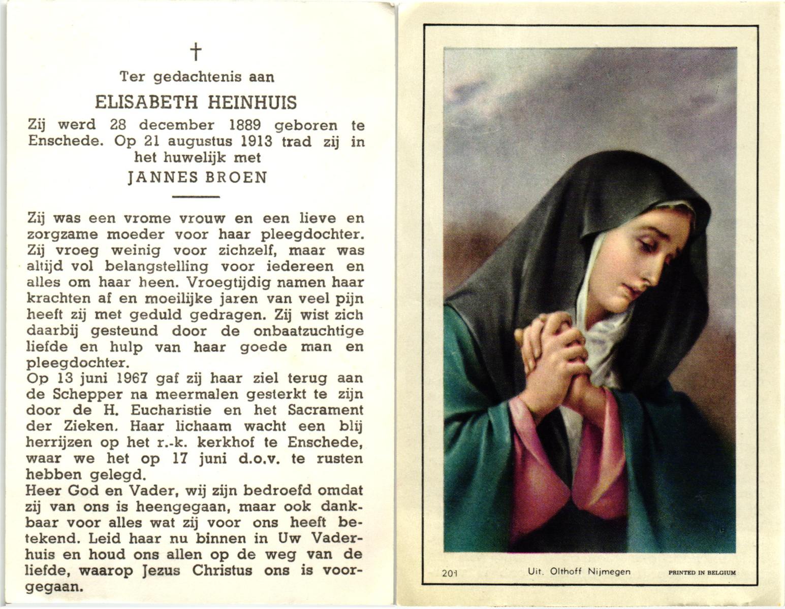 HEINHUIS, Elisabeth, geboren op 28-12-1889 te Enschede, overleden op 13-6-1967 op 77-jarige leeftijd, begraven op 17-6-1967 te Enschede.
