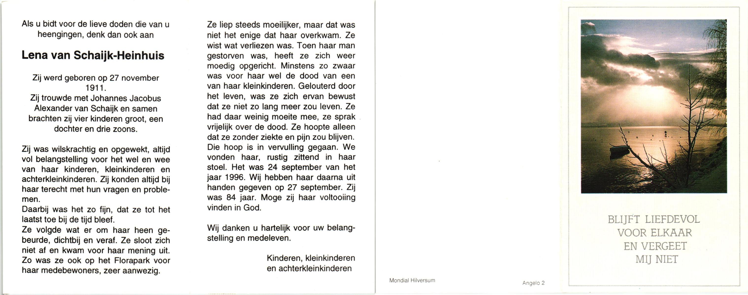 HEINHUIS, Lena, geboren op 27-11-1911, overleden op 24-9-1996 op 84-jarige leeftijd.