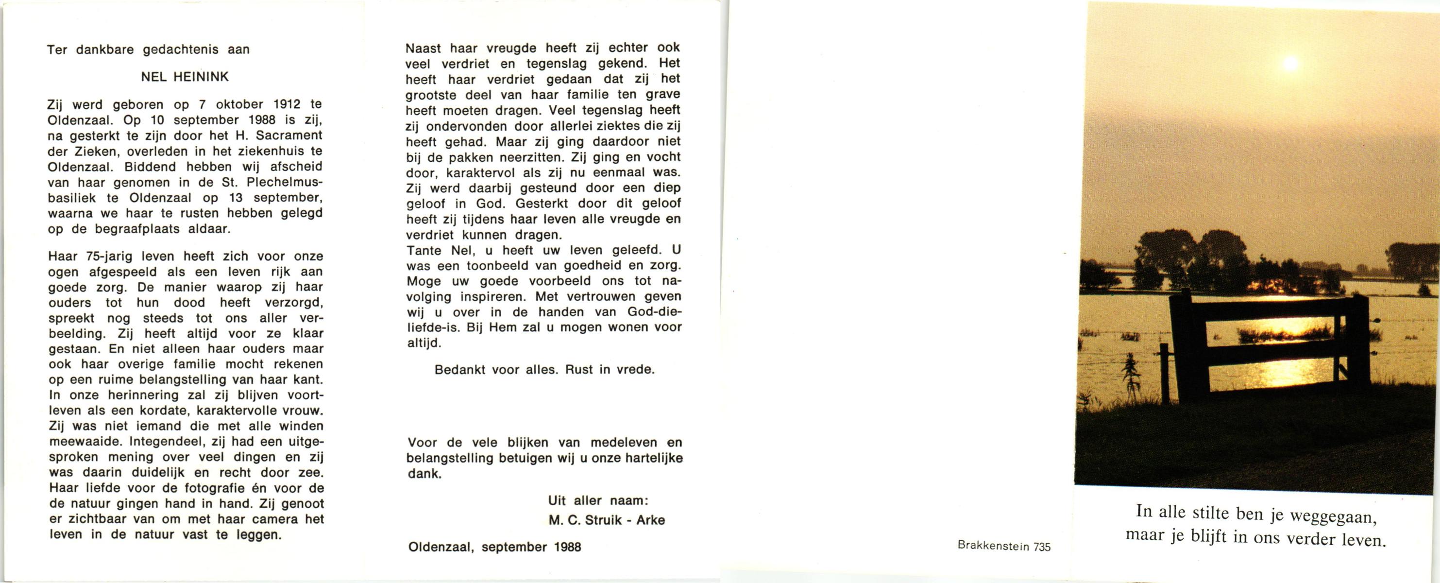 HEININK, Nel, geboren op 7-10-1912 te Oldenzaal, overleden op 10-9-1988 te Oldenzaal, ziekenhuis op 75-jarige leeftijd, begraven op 13-9-1988 te Oldenzaal.