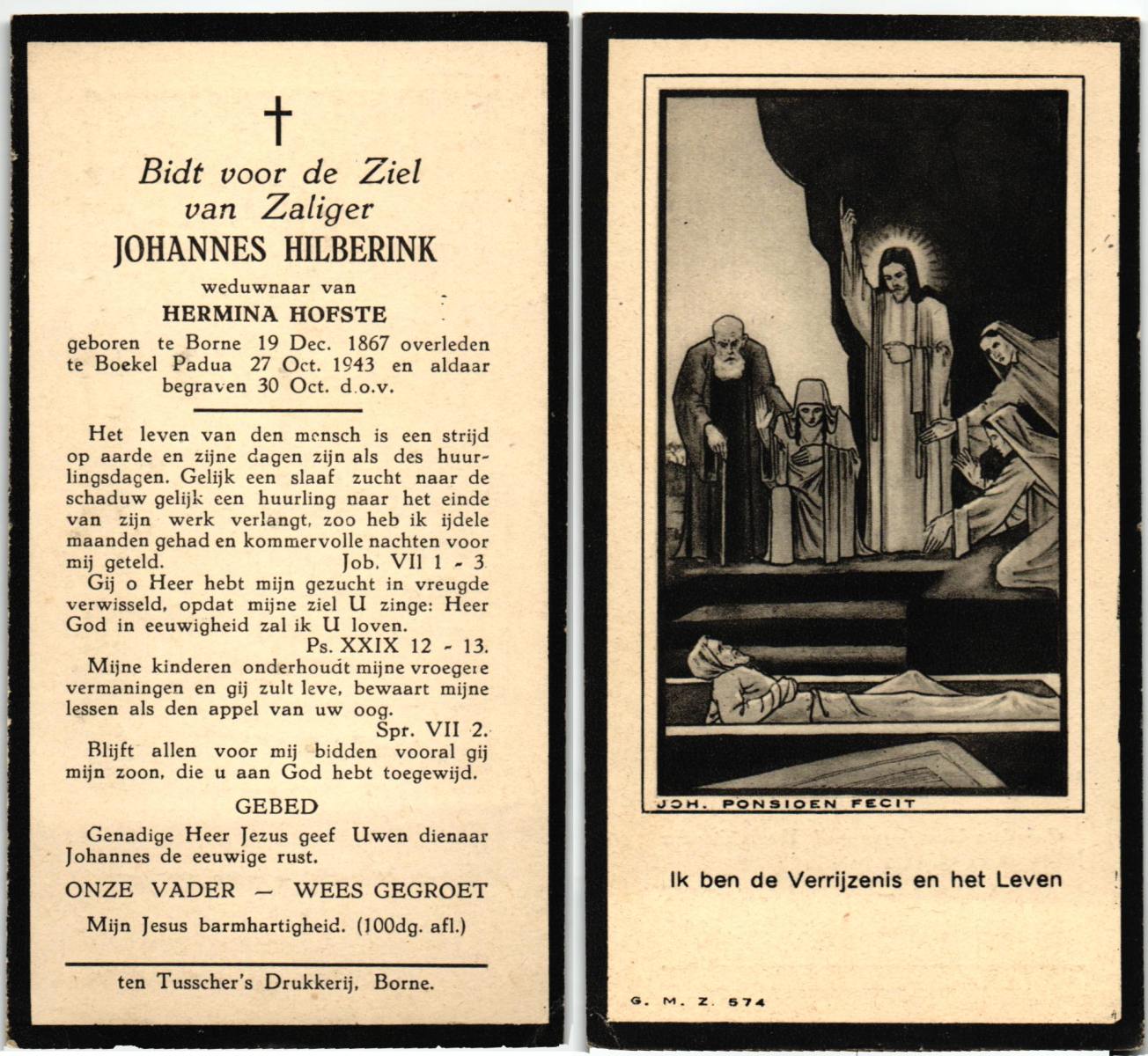 HILBERINK, Johannes, geboren op 19-12-1867 te Borne, overleden op 27-10-1943 te Boekel Padua, N. Br. op 75-jarige leeftijd, begraven op 30-10-1943 te Boekel Padua.