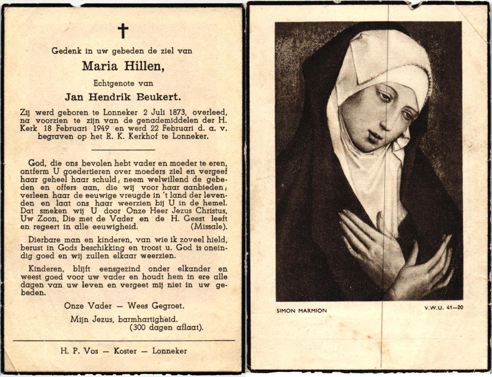 HILLEN, Maria, geboren op 02-07-1873 te Lonneker, overleden op 18-2-1949 op 75-jarige leeftijd, begraven op 22-2-1949 te Lonneker.