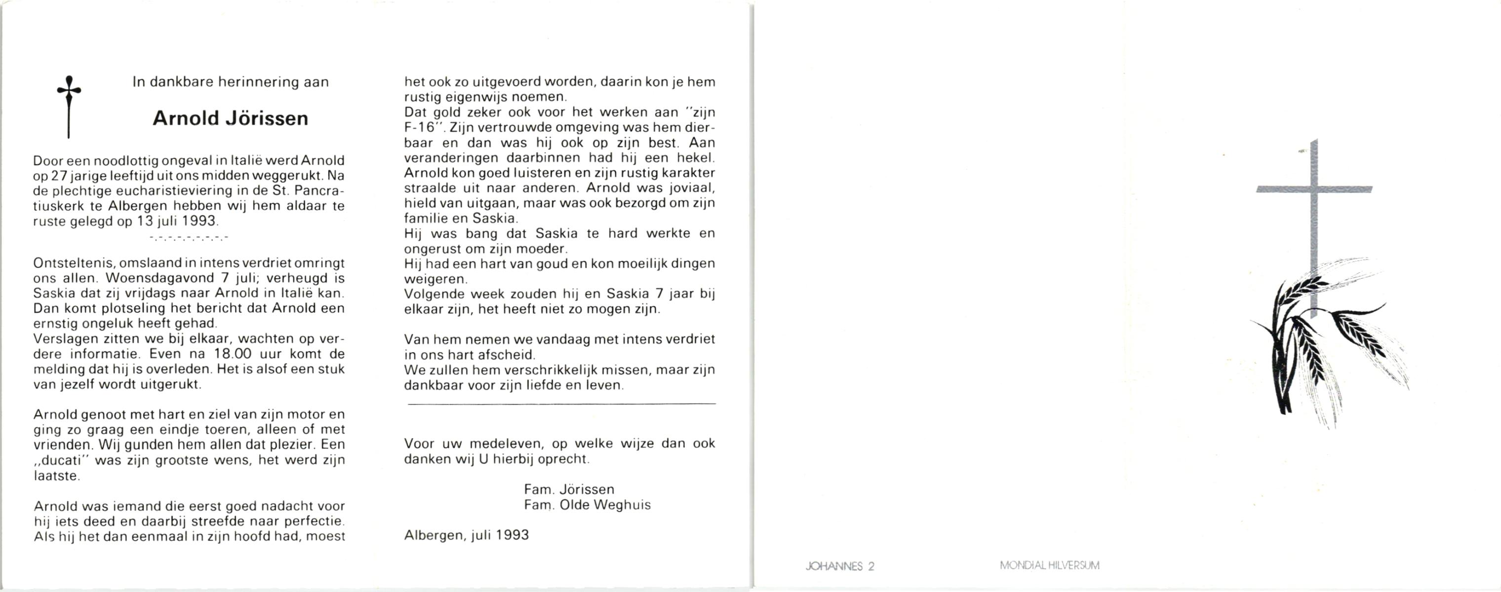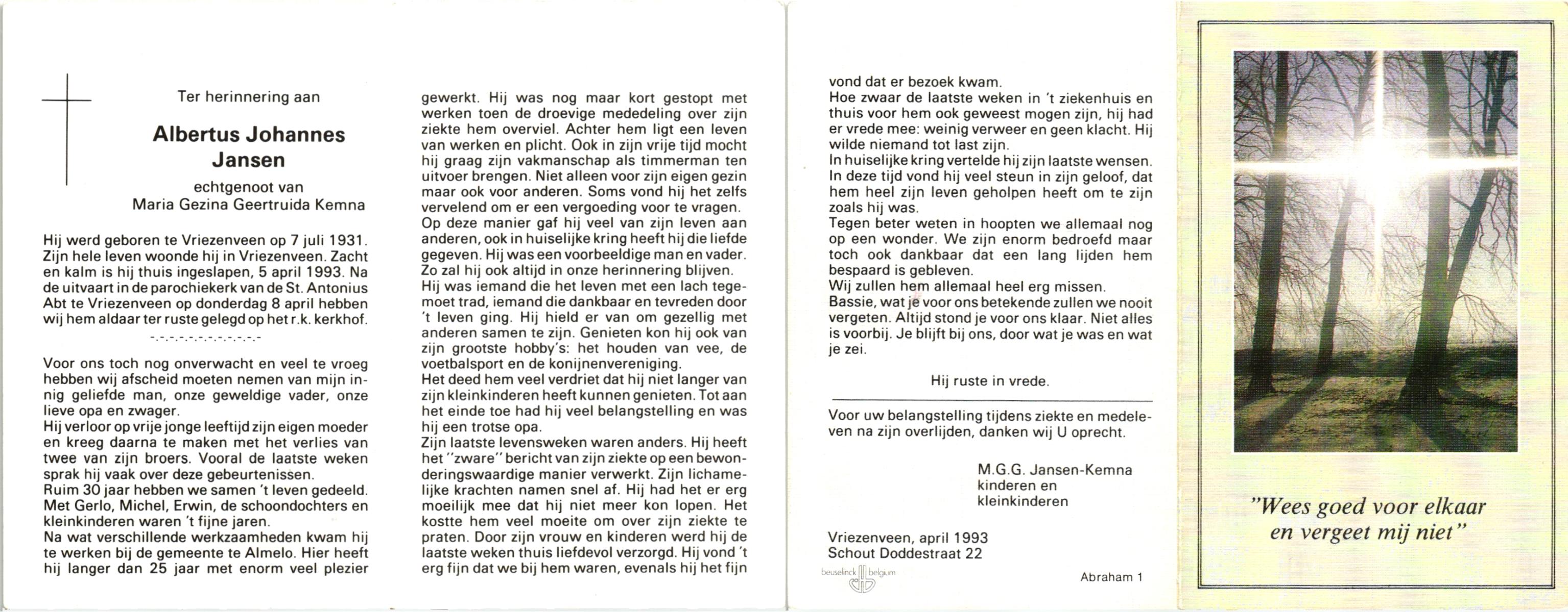 JANSEN, , Albertus Johannes, geboren op 7-7-1931 te Vriezenveen, overleden op 5-4-1993 te Vriezenveen op 61-jarige leeftijd, begraven op 8-4-1993 te Vriezenveen.