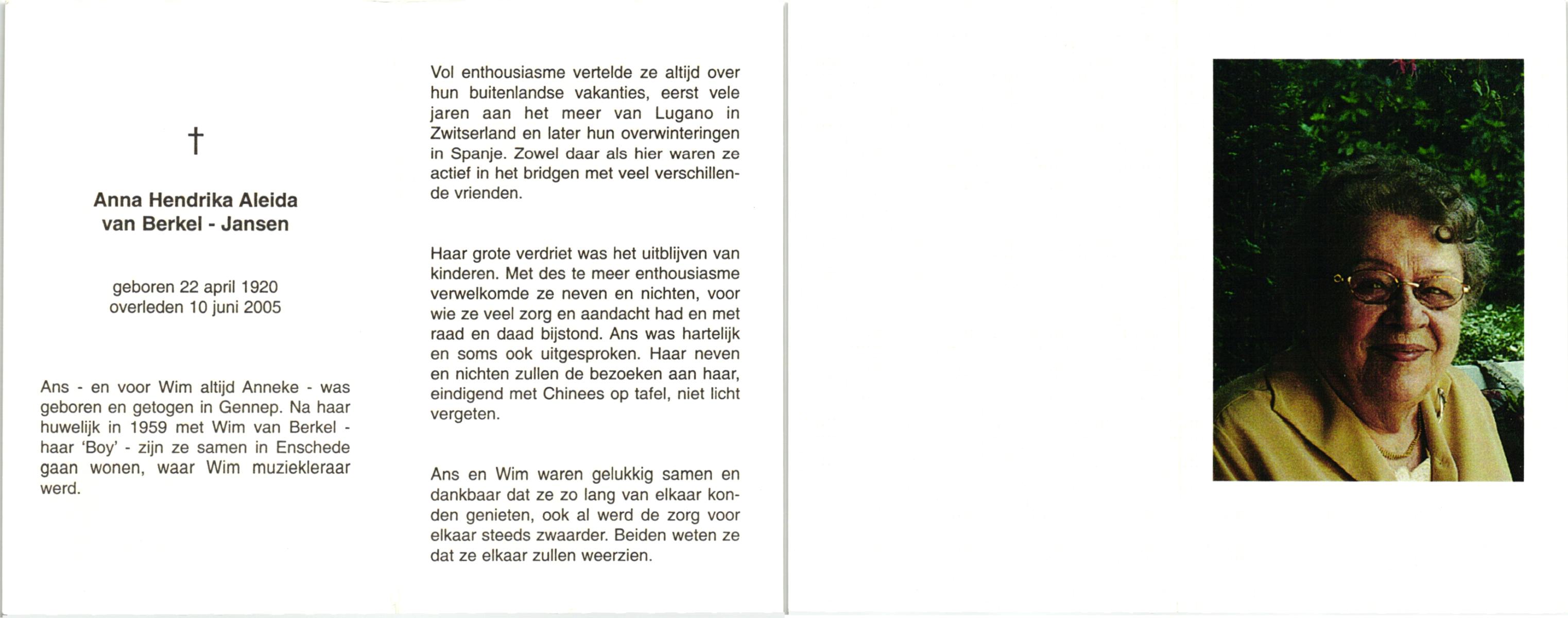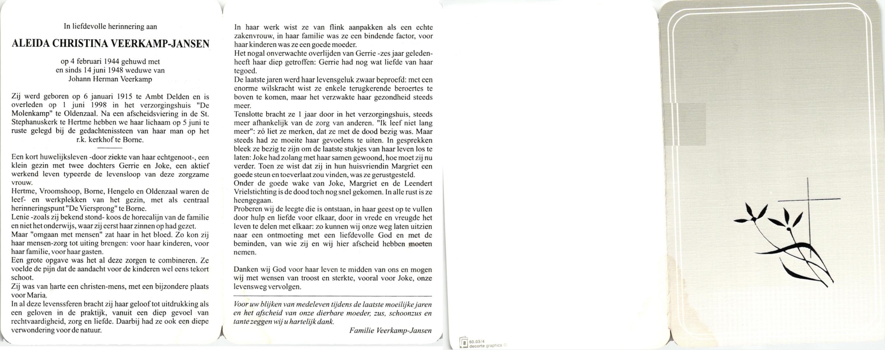 JANSEN, , Aleida Christina, geboren op 6-1-1915 te Delden, Ambt, overleden op 1-6-1988 te Oldenzaal op 73-jarige leeftijd, begraven op 5-6-1988 te Borne.