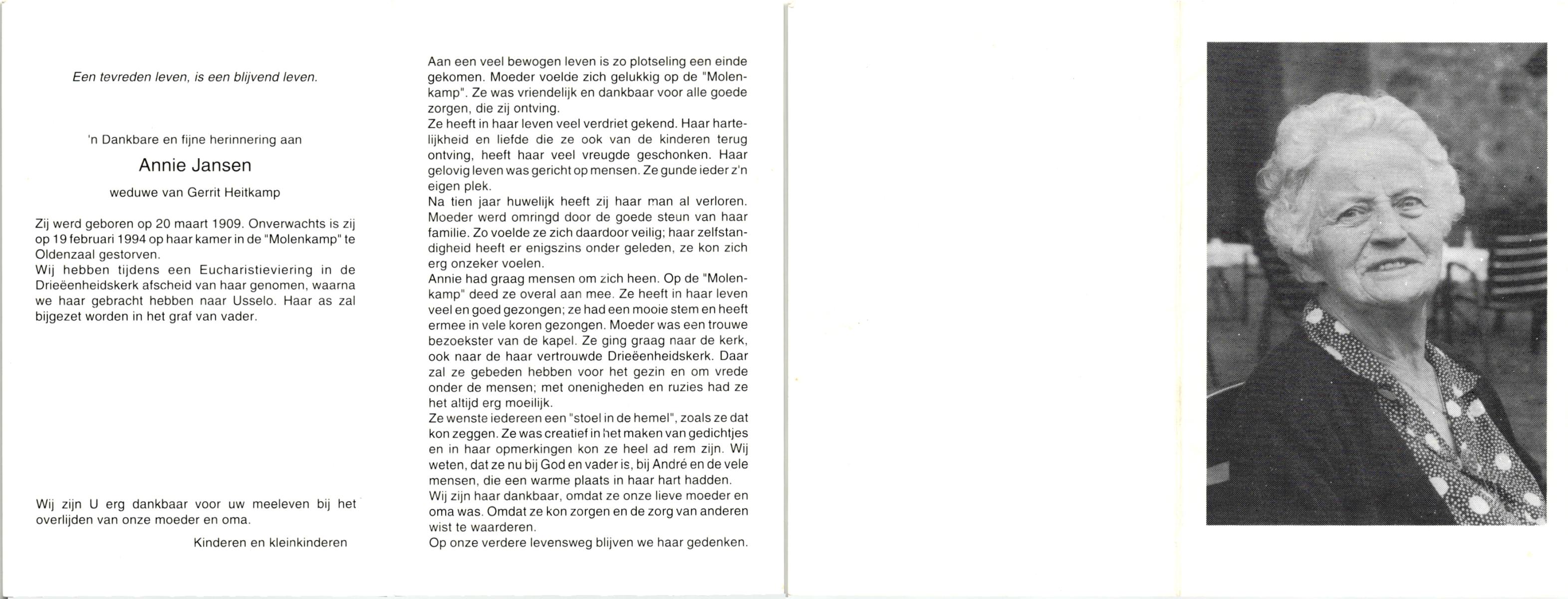 JANSEN, , Annie, geboren op 20-3-1909, overleden op 19-2-1994 te Oldenzaal op 84-jarige leeftijd, gecremeerd te Usselo.