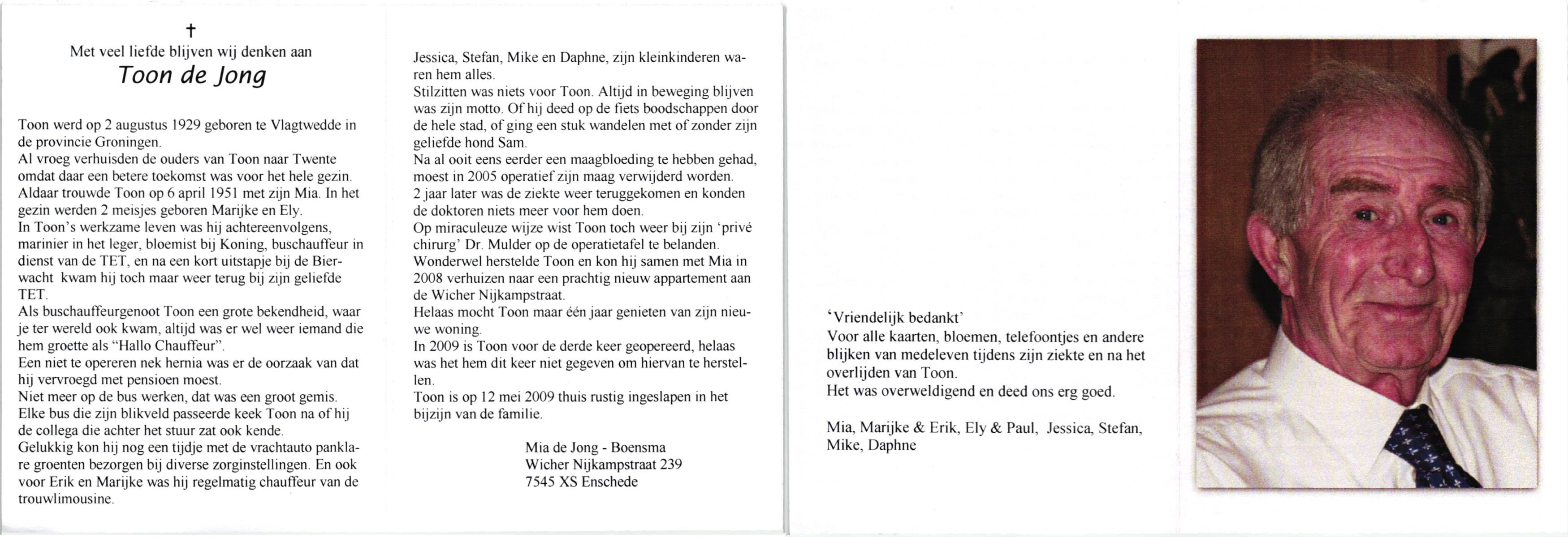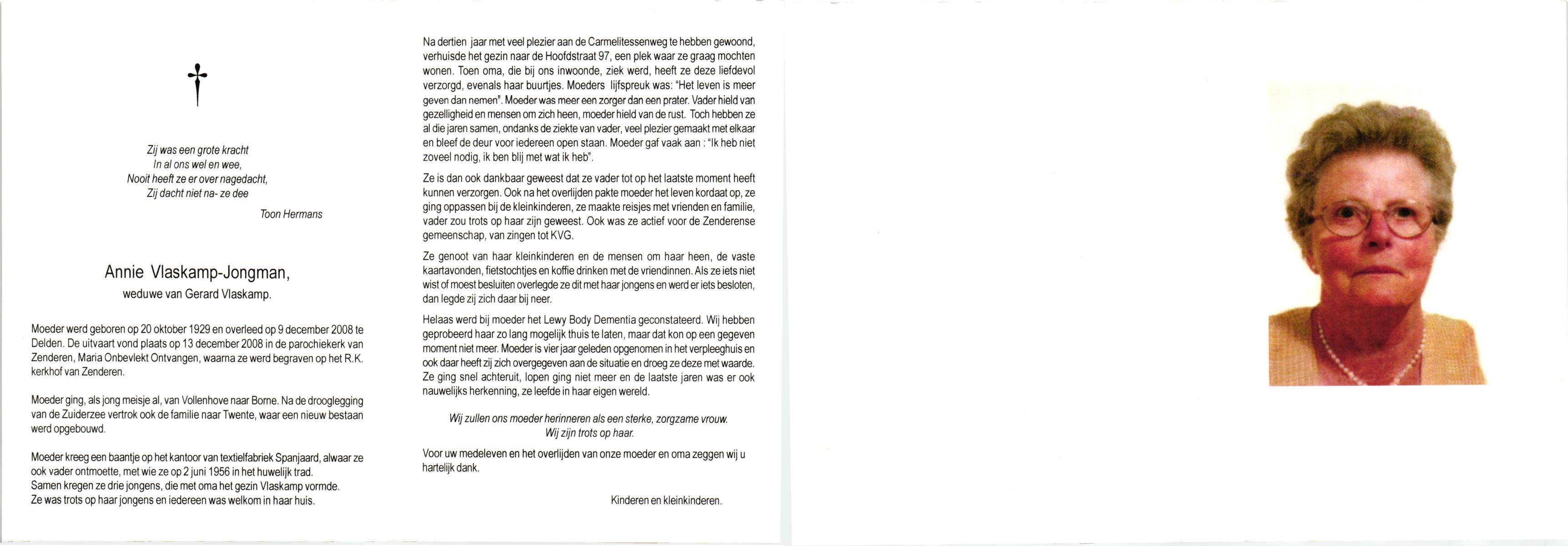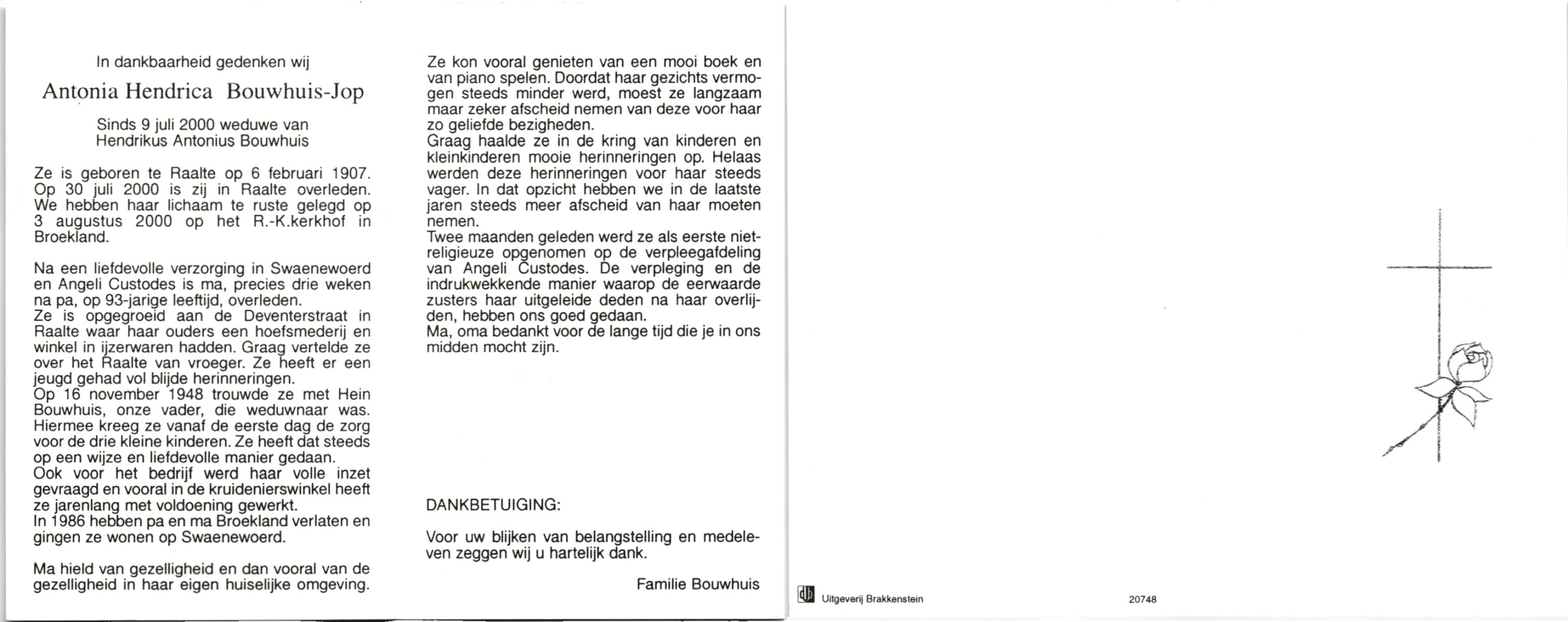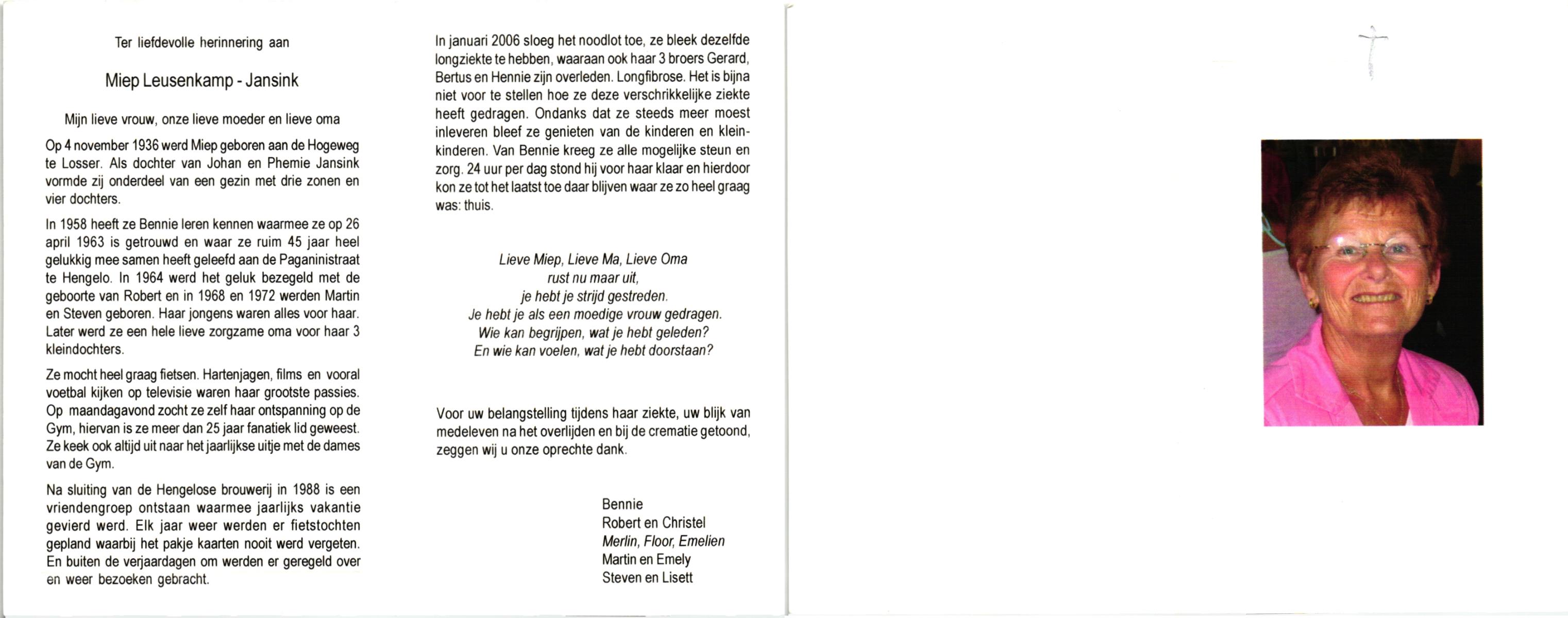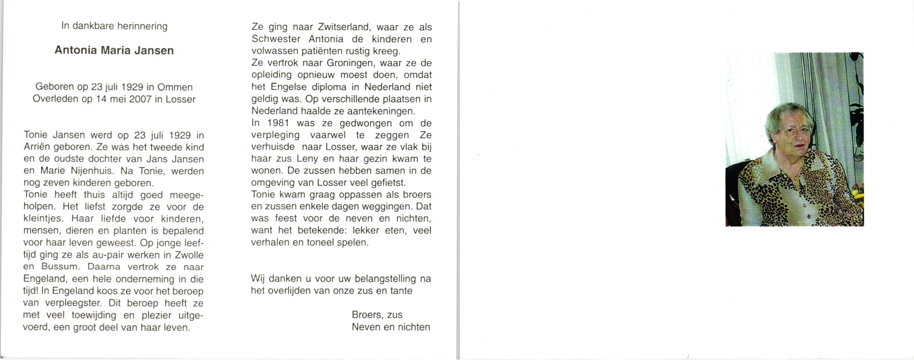 JANSEN, , Antonia Maria, geboren op 23-7-1929 te Ommen, overleden op 14-5-2007 te Losser op 77-jarige leeftijd.