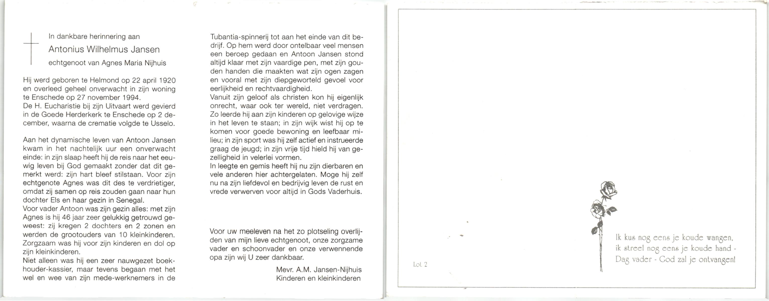 JANSEN, , Antonius Wilhelmus, geboren op 22-4-1920 te Helmond, overleden op 27-11-1994 te Enschede op 74-jarige leeftijd, gecremeerd op 2-12-1994 te Usselo.