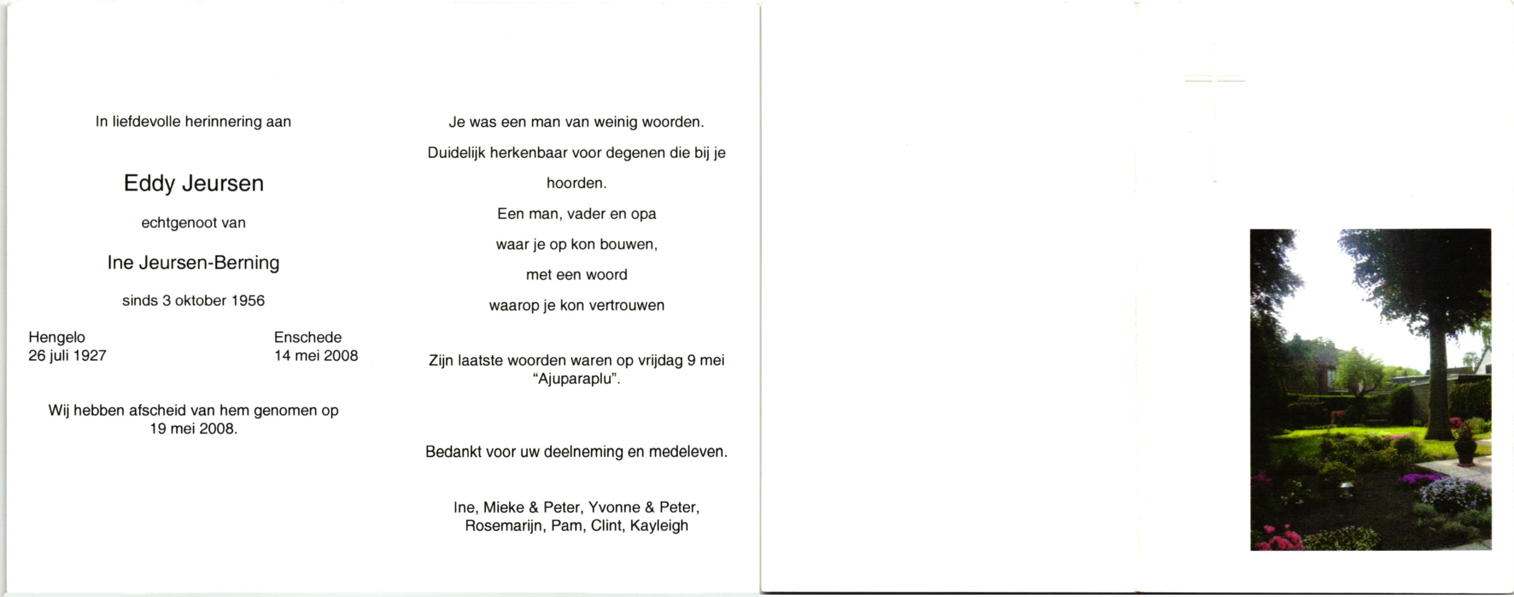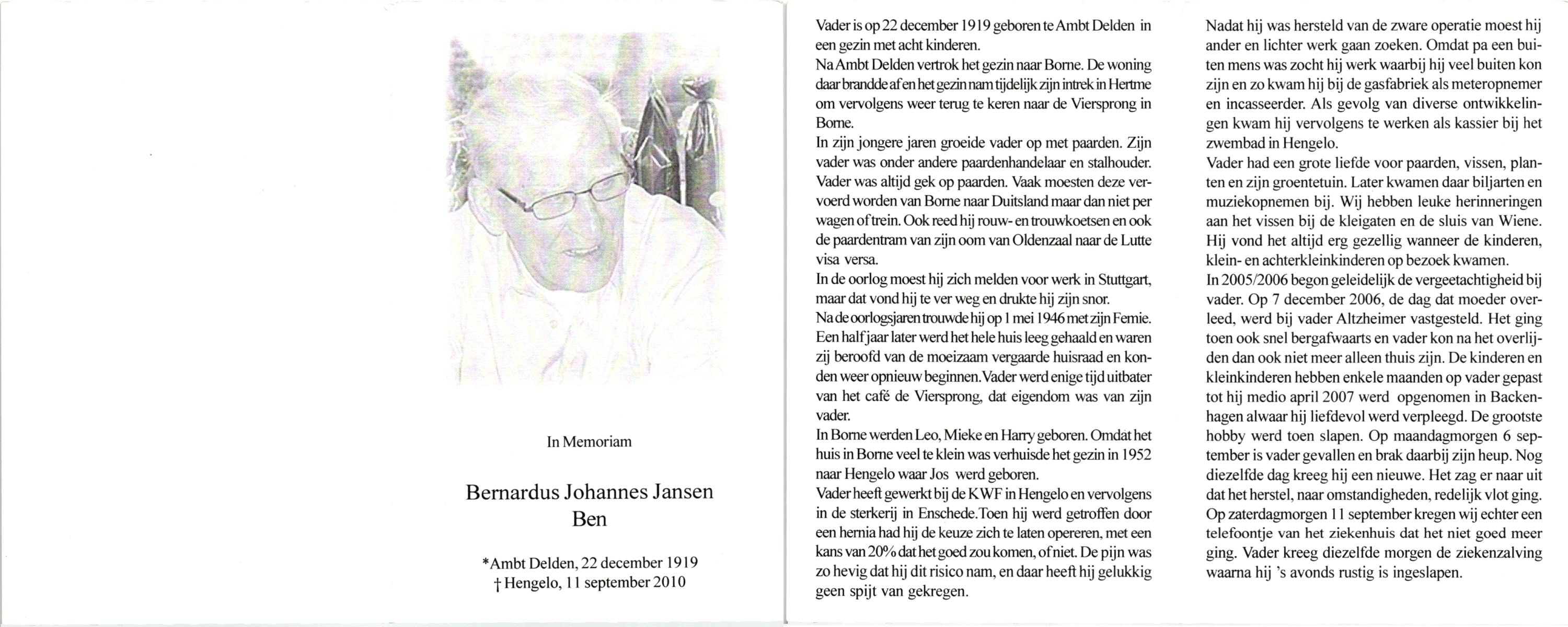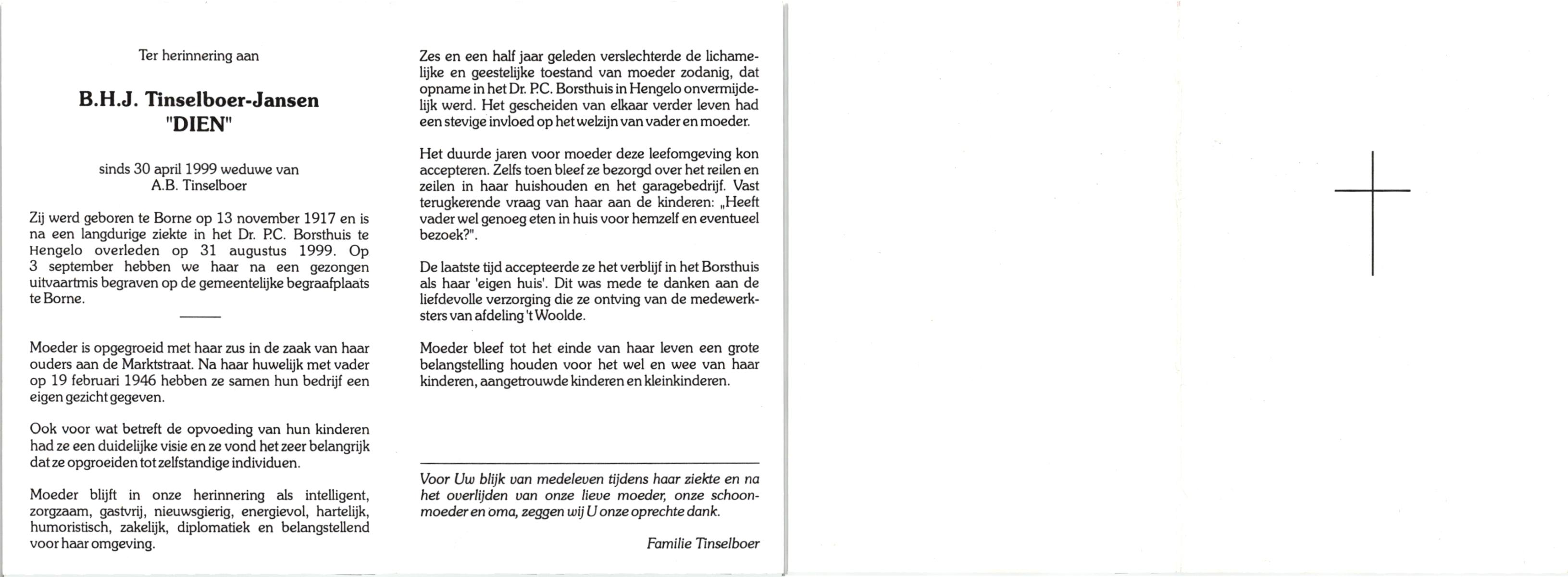 JANSEN, , B.H.J. (Dien), geboren op 13-11-1917 te Borne, overleden op 31-8-1999 te Hengelo (O) op 81-jarige leeftijd, begraven op 3-9-1999 te Borne.