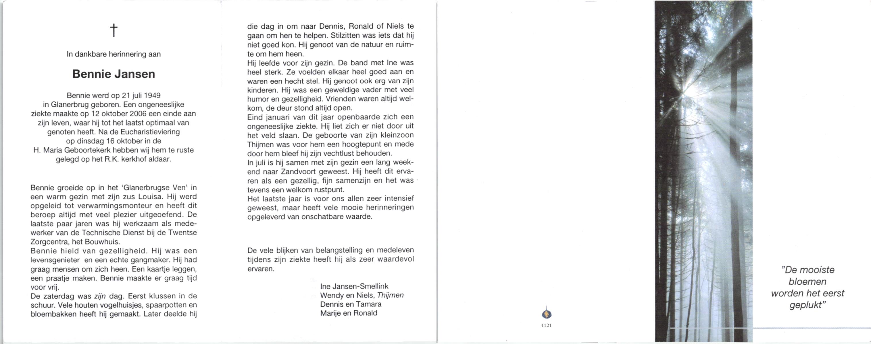 JANSEN, , Bennie, geboren op 21-7-1949 te Glanerbrug, overleden op 12-10-2006 op 57-jarige leeftijd, begraven op 16-10-2006 te Glanerbrug.