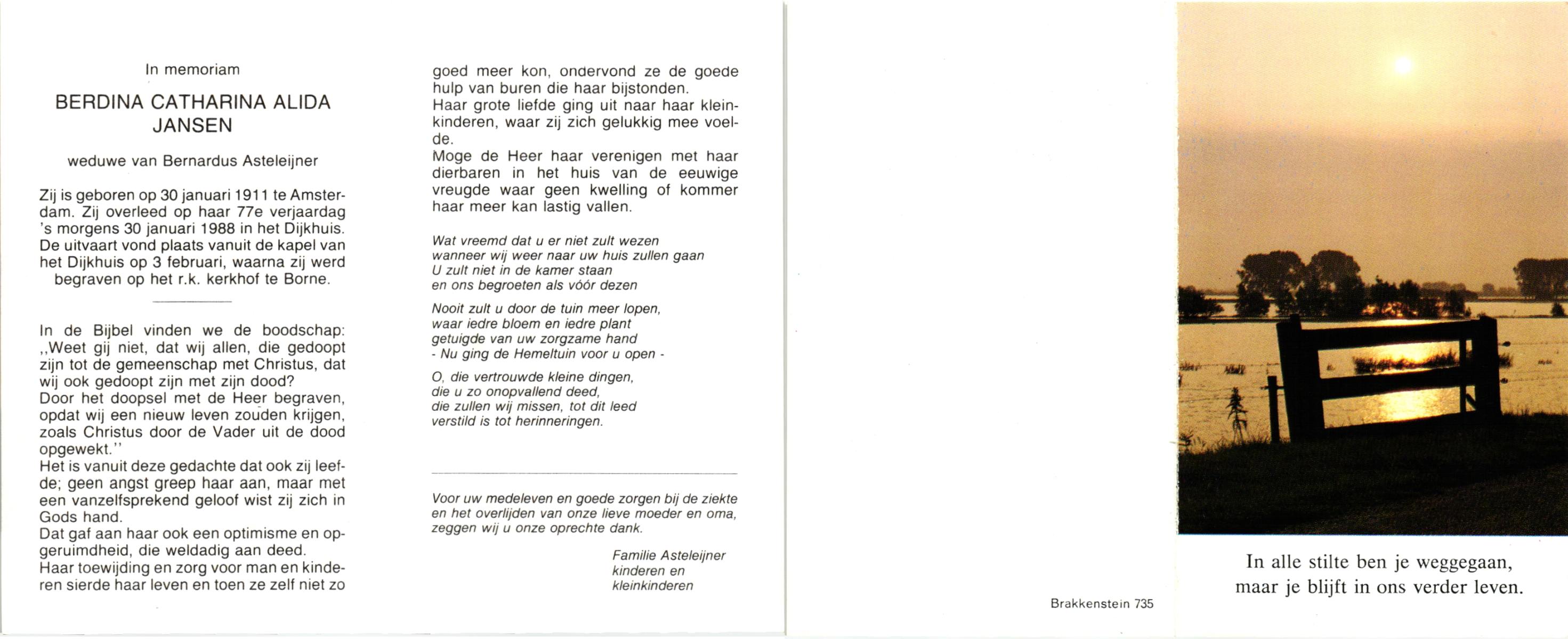 JANSEN, , Berdina Catharina Alida, geboren op 30-1-1911 te Amsterdam, overleden op 30-1-1988 te Borne op 77-jarige leeftijd, begraven op 3-2-1988 te Borne.