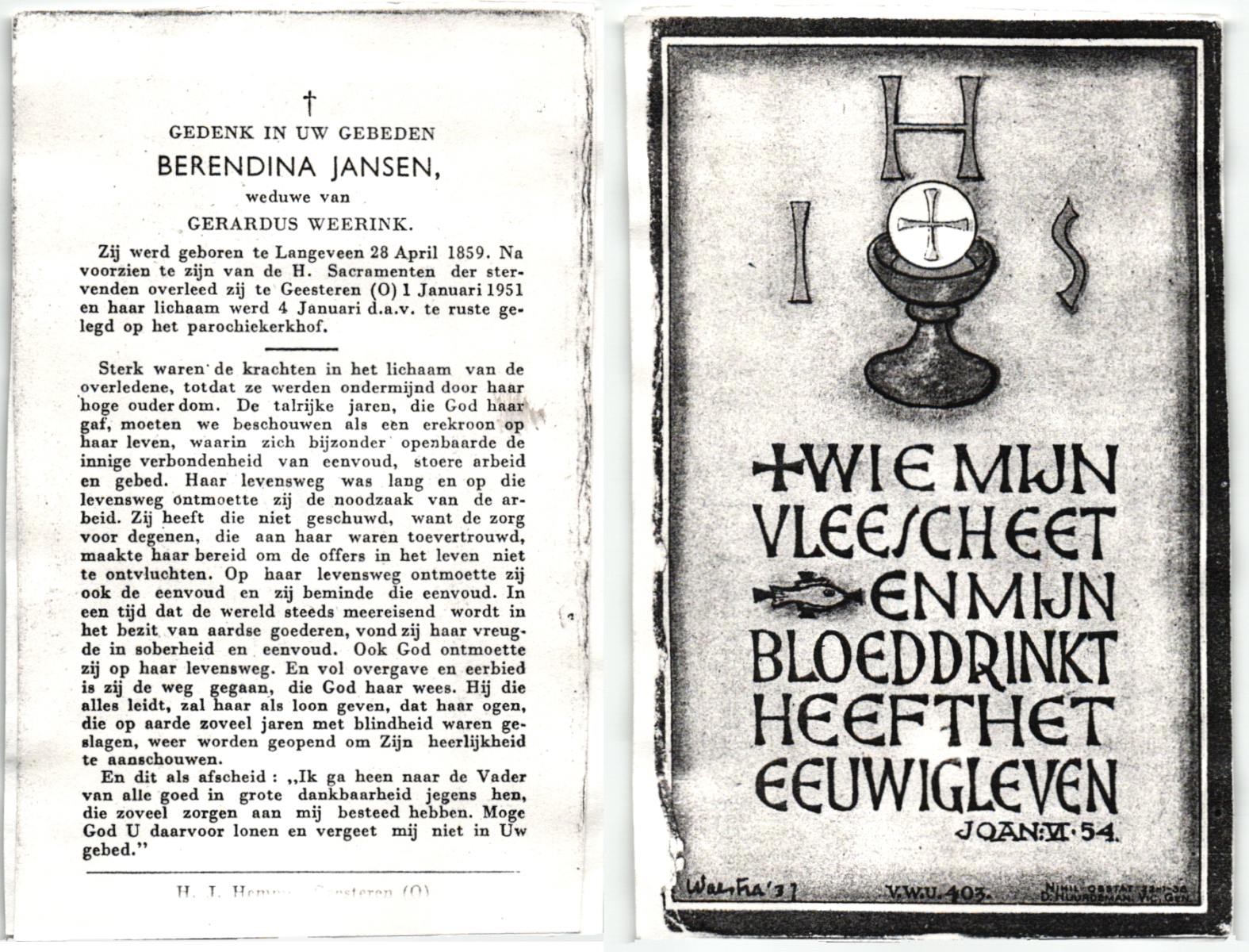 JANSEN, , Berendina, geboren op 28-04-1859 te Langeveen, overleden op 1-1-1951 te Geesteren op 91-jarige leeftijd, begraven op 4-1-1951 te Geesteren.