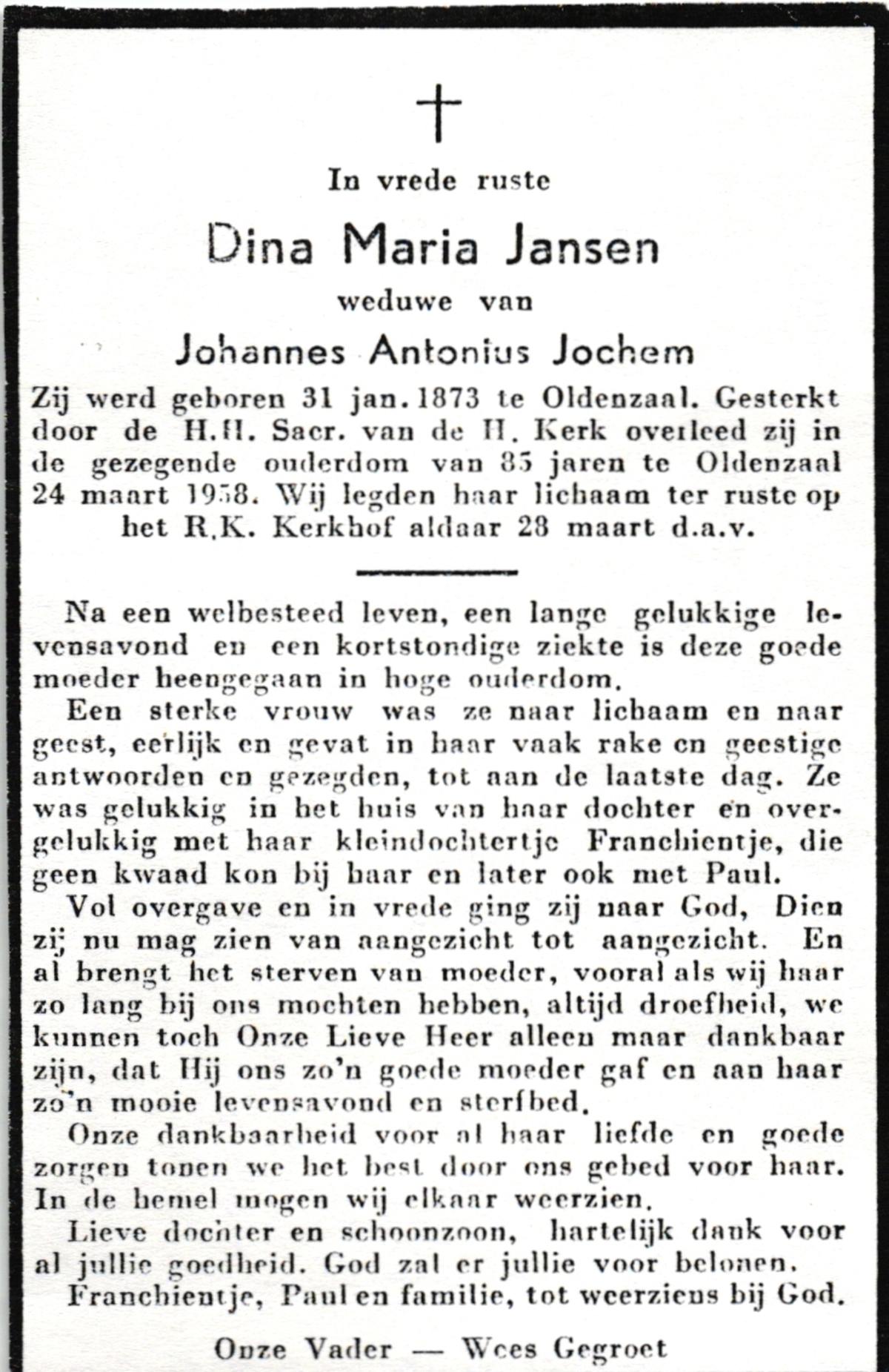 JANSEN, , Dina Maria, geboren op 31-01-1873 te Oldenzaal, overleden op 24-3-1958 te Oldenzaal op 85-jarige leeftijd, begraven op 28-3-1958 te Oldenzaal.