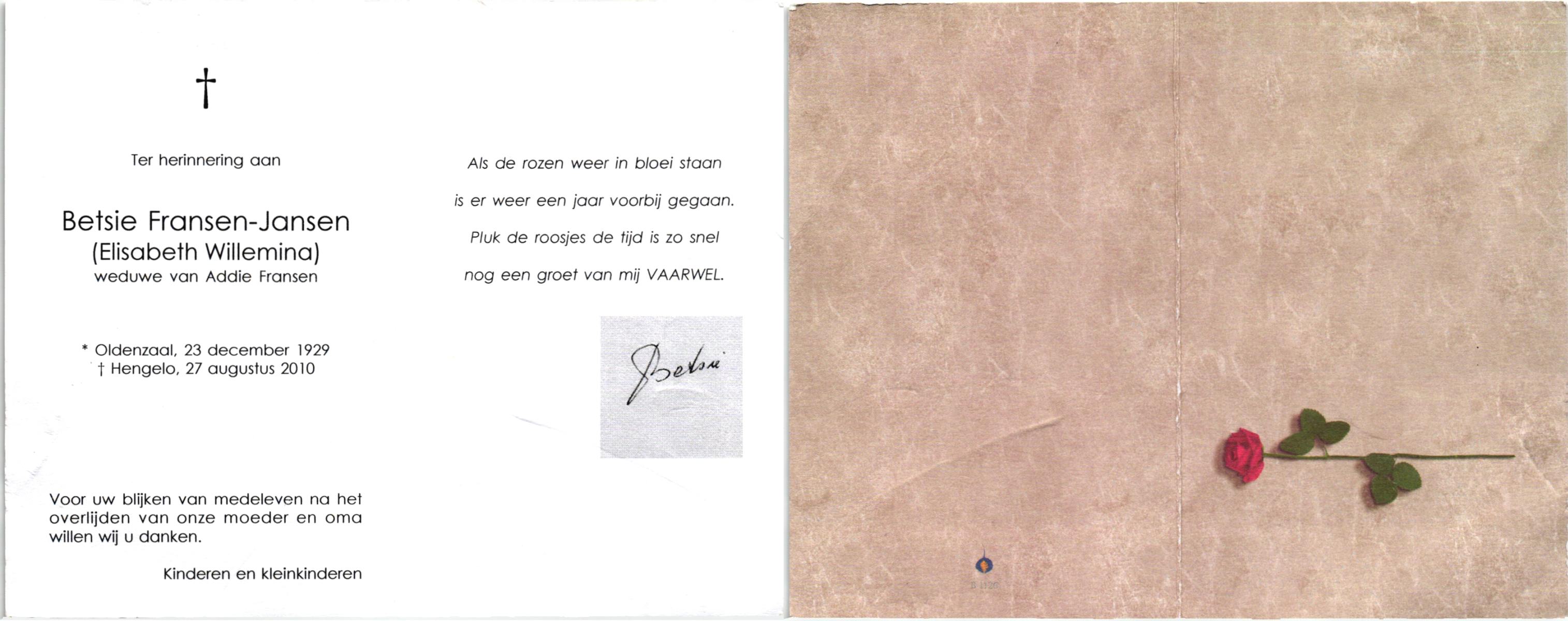 JANSEN, Marietje, geboren op 16-8-1917 te Raalte, overleden op 31-8-2008 te Enschede op 91-jarige leeftijd.