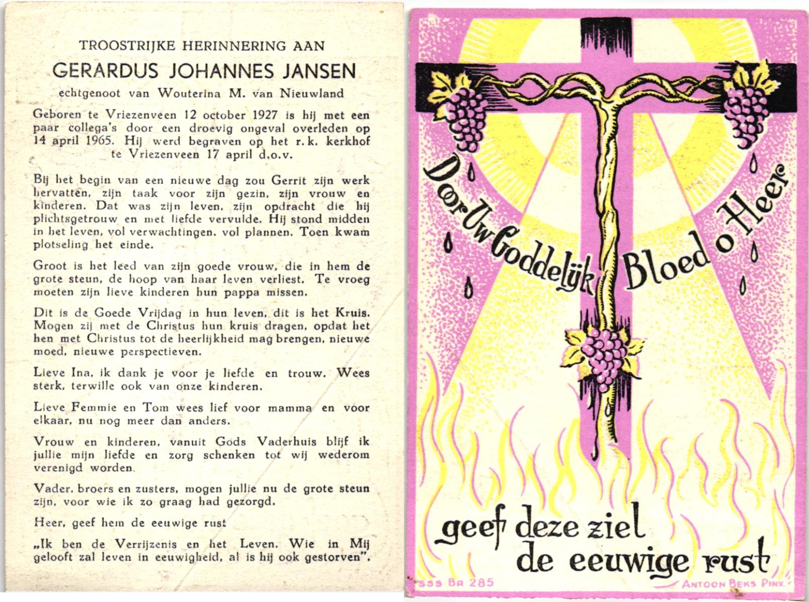 JANSEN, , Gerardus Johannes, geboren op 12-10-1927 te Vriezenveen, overleden op 14-4-1965 op 37-jarige leeftijd, begraven op 17-4-1965 te Vriezenveen.