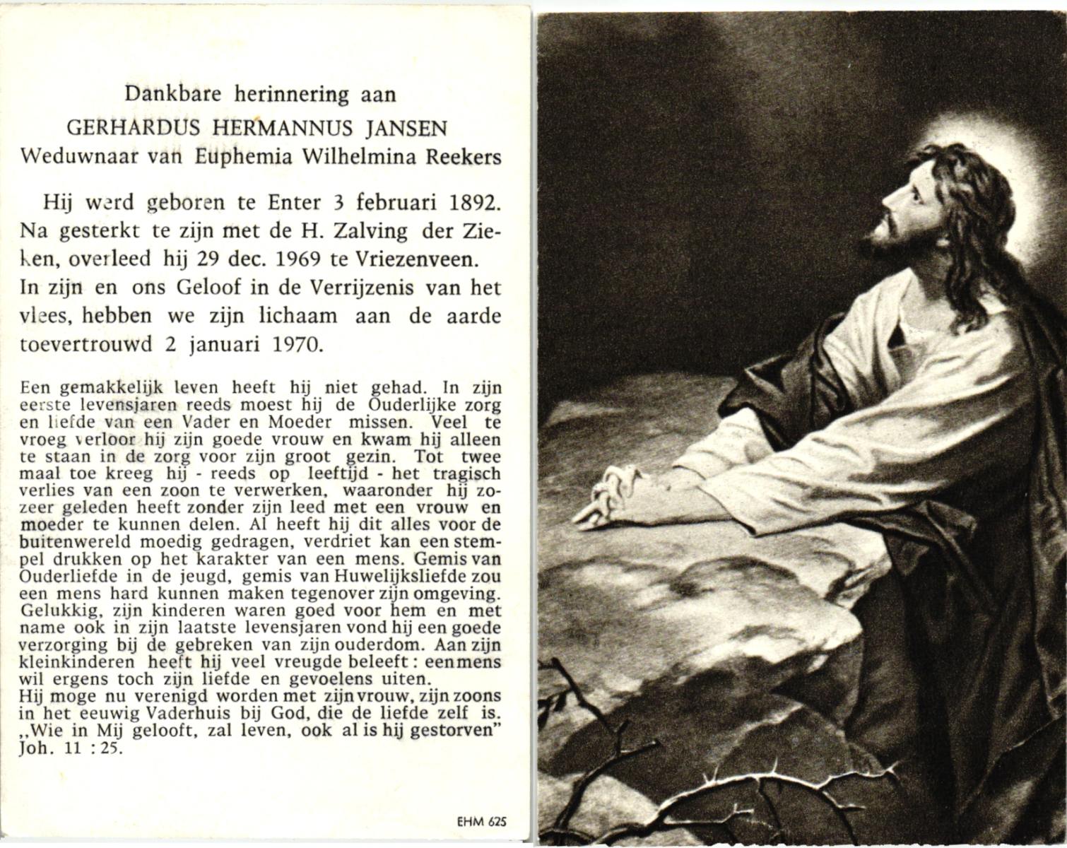 JANSEN, , Gerhardus Hermannus, geboren op 03-02-1892 te Wierden, Enter, overleden op 29-12-1969 te Vriezenveen op 77-jarige leeftijd, begraven op 2-1-1970.