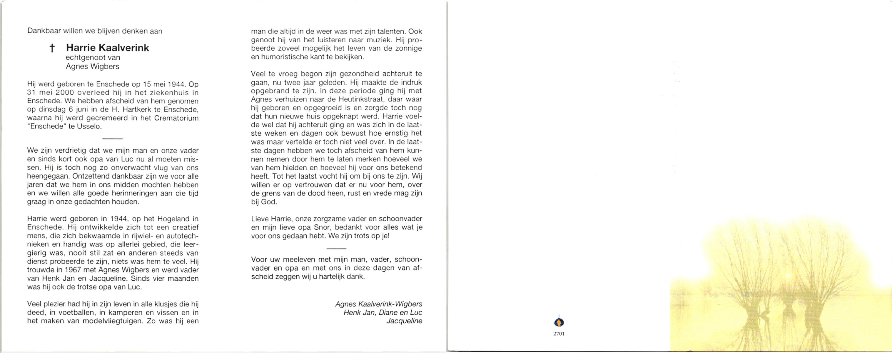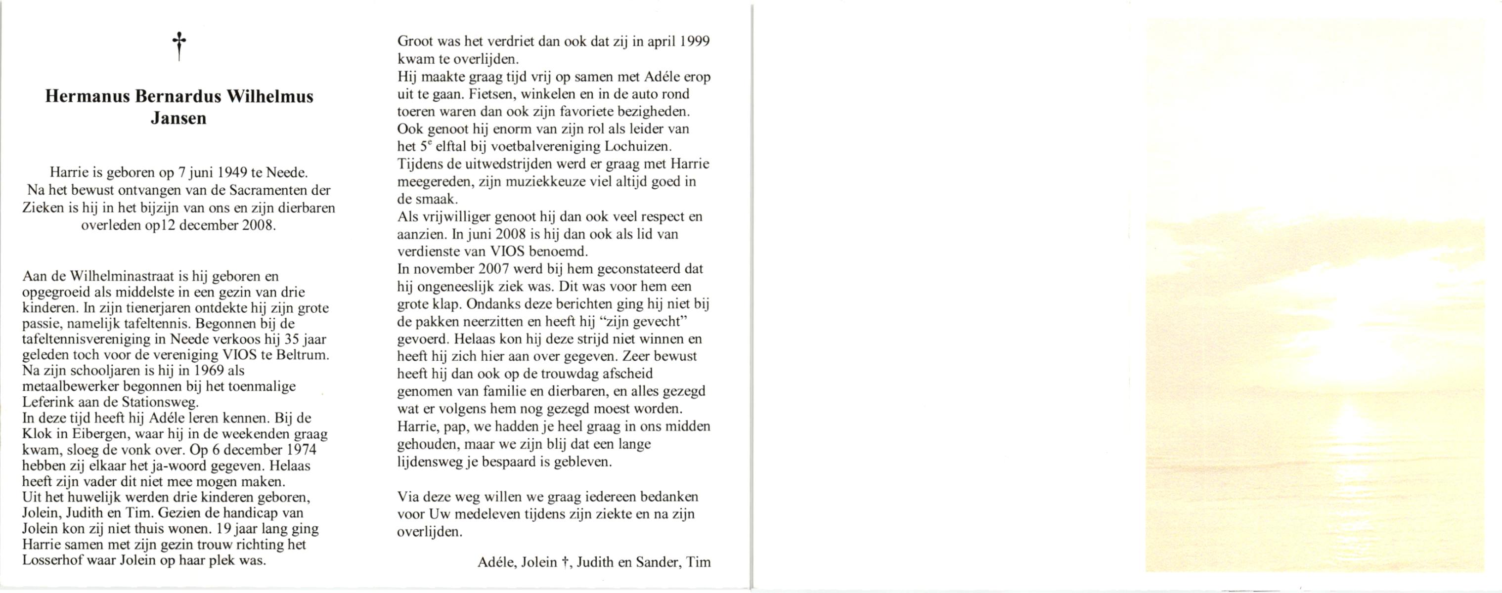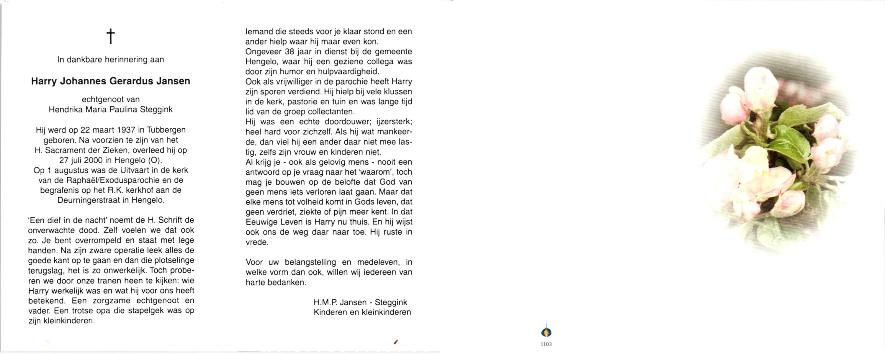 JANSEN, , Harry Johannes Gerardus, geboren op 22-3-1937 te Tubbergen, overleden op 27-7-2000 te Hengelo (O) op 63-jarige leeftijd, begraven op 1-8-2000 te Hengelo.