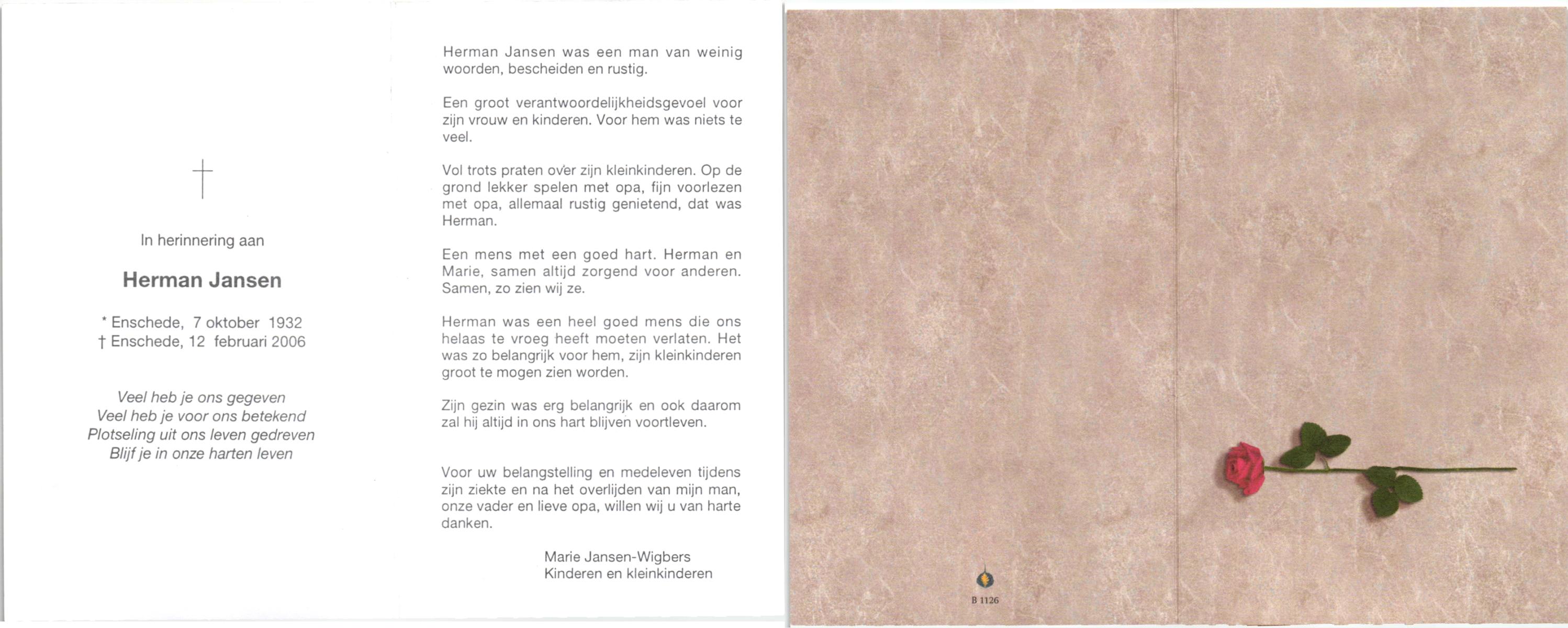 JANSEN, , Herman, geboren op 7-10-1932 te Enschede, overleden op 12-2-2006 te Enschede op 73-jarige leeftijd.