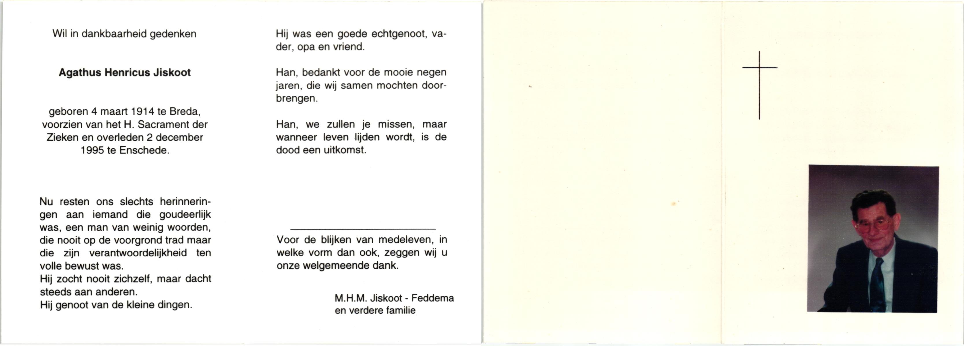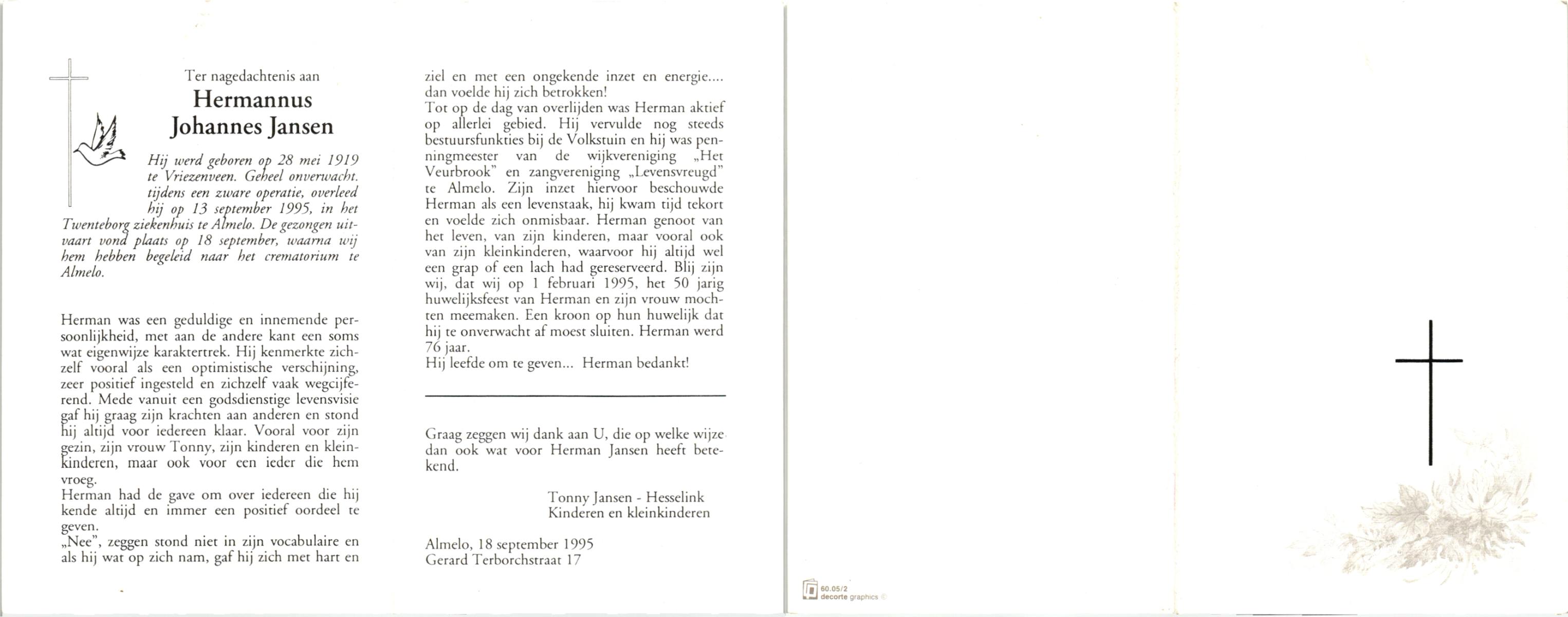 JANSEN, , Hermannus Johannes, geboren op 28-5-1919 te Vriezenveen, overleden op 13-9-1995 te Almelo op 76-jarige leeftijd, gecremeerd op 18-9-1995 te Almelo.